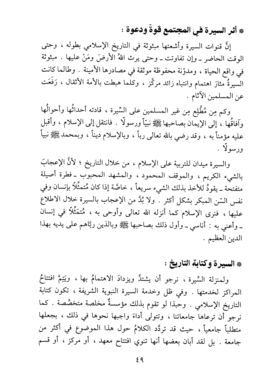 ولمنزلة السّيرة، نرجو أن يشتدّ ويزداد الاهتمام بها، ويتمّ افتتاح المراكز لخدمتها. وفي ظل وخدمة السيرة النبوية الشريفة، تكون كتابة التاريخ الإسلامي. وحبذا لو تقوم بذلك مؤسسة مخلصة متخصّصة. كما نرجو أن ترعاها جامعاتنا، وتتولى أداء واجبها نحوها في ذلك، بجعلها متطلبا جامعيا، حيث قد تردّد الكلام حول هذا الموضوع في أكثر من جامعة. بل لقد أبان بعضها أنها تنوي افتتاح معهد، أو مركز، أو قسم