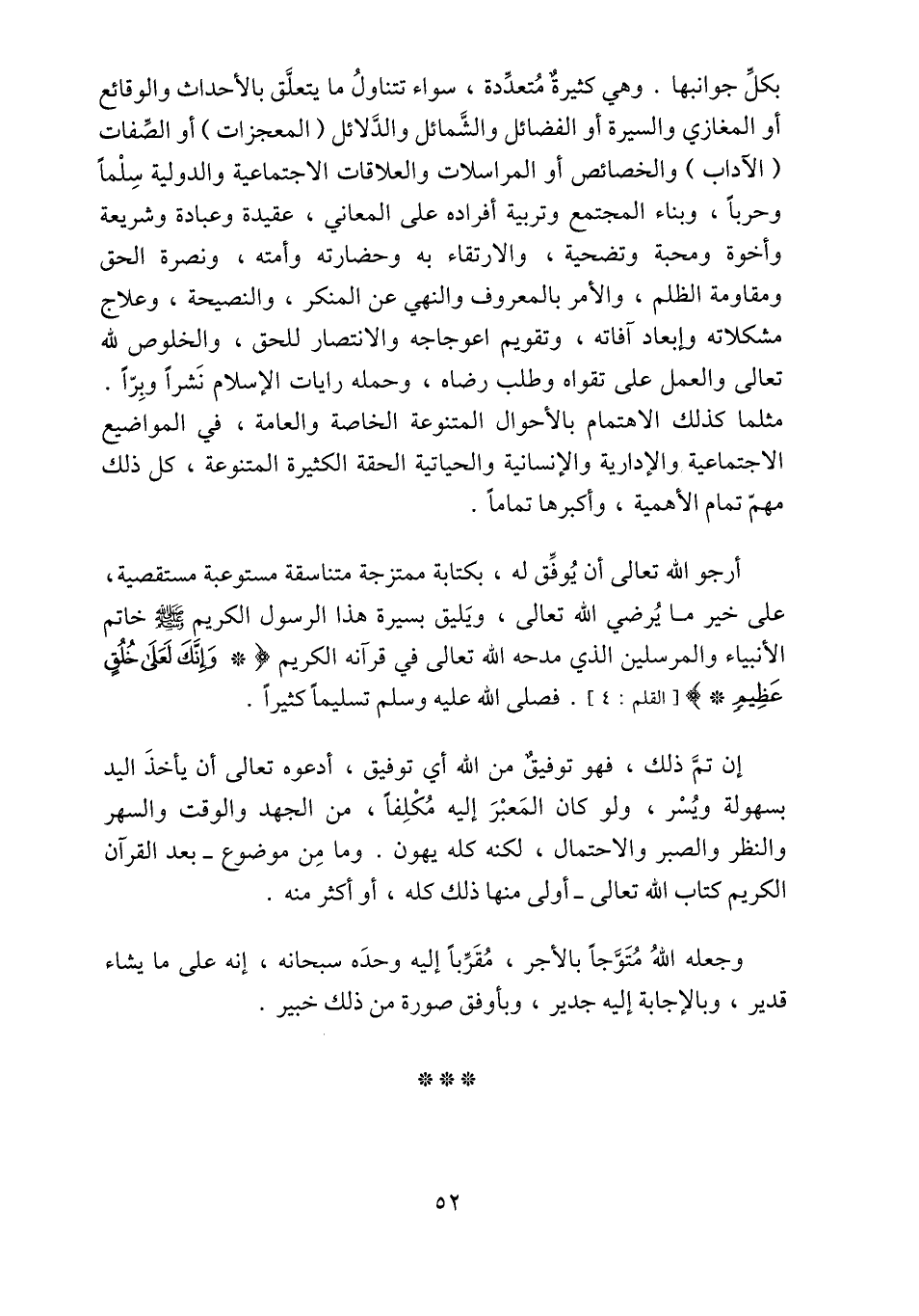 أرجو الله تعالى أن يوفّق له، بكتابة ممتزجة متناسقة مستوعبة مستقصية، على خير ما يرضي الله تعالى، ويليق بسيرة هذا الرسول الكريم صلّى الله عليه وسلم خاتم الأنبياء والمرسلين الذي مدحه الله تعالى في قرآنه الكريم وَإِنَّكَ لَعَلى خُلُقٍ عَظِيمٍ [القلم: 4] . فصلى الله عليه وسلم تسليما كثيرا.