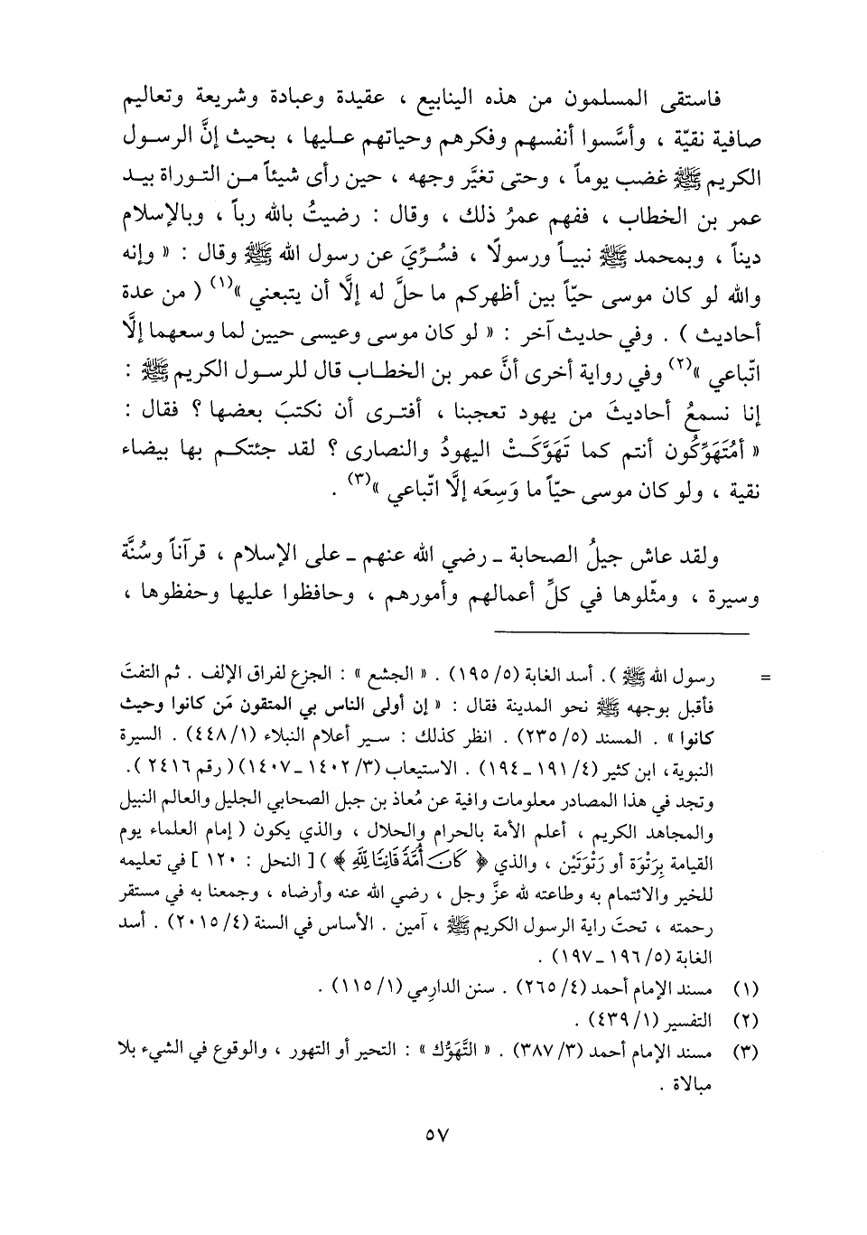 فاستقى المسلمون من هذه الينابيع، عقيدة وعبادة وشريعة وتعاليم صافية نقيّة، وأسّسوا أنفسهم وفكرهم وحياتهم عليها، بحيث إنّ الرسول الكريم صلّى الله عليه وسلم غضب يوما، وحتى تغيّر وجهه، حين رأى شيئا من التوراة بيد عمر بن الخطاب، ففهم عمر ذلك، وقال: رضيت بالله ربا، وبالإسلام دينا، وبمحمد صلّى الله عليه وسلم نبيا ورسولا، فسرّي عن رسول الله صلّى الله عليه وسلم وقال: «وإنه والله لو كان موسى حيّا بين أظهركم ما حلّ له إلّا أن يتبعني» «1» (من عدة أحاديث) . وفي حديث آخر: «لو كان موسى وعيسى حيين لما وسعهما إلّا اتّباعي» «2» وفي رواية أخرى أنّ عمر بن الخطاب قال للرسول الكريم صلّى الله عليه وسلم: