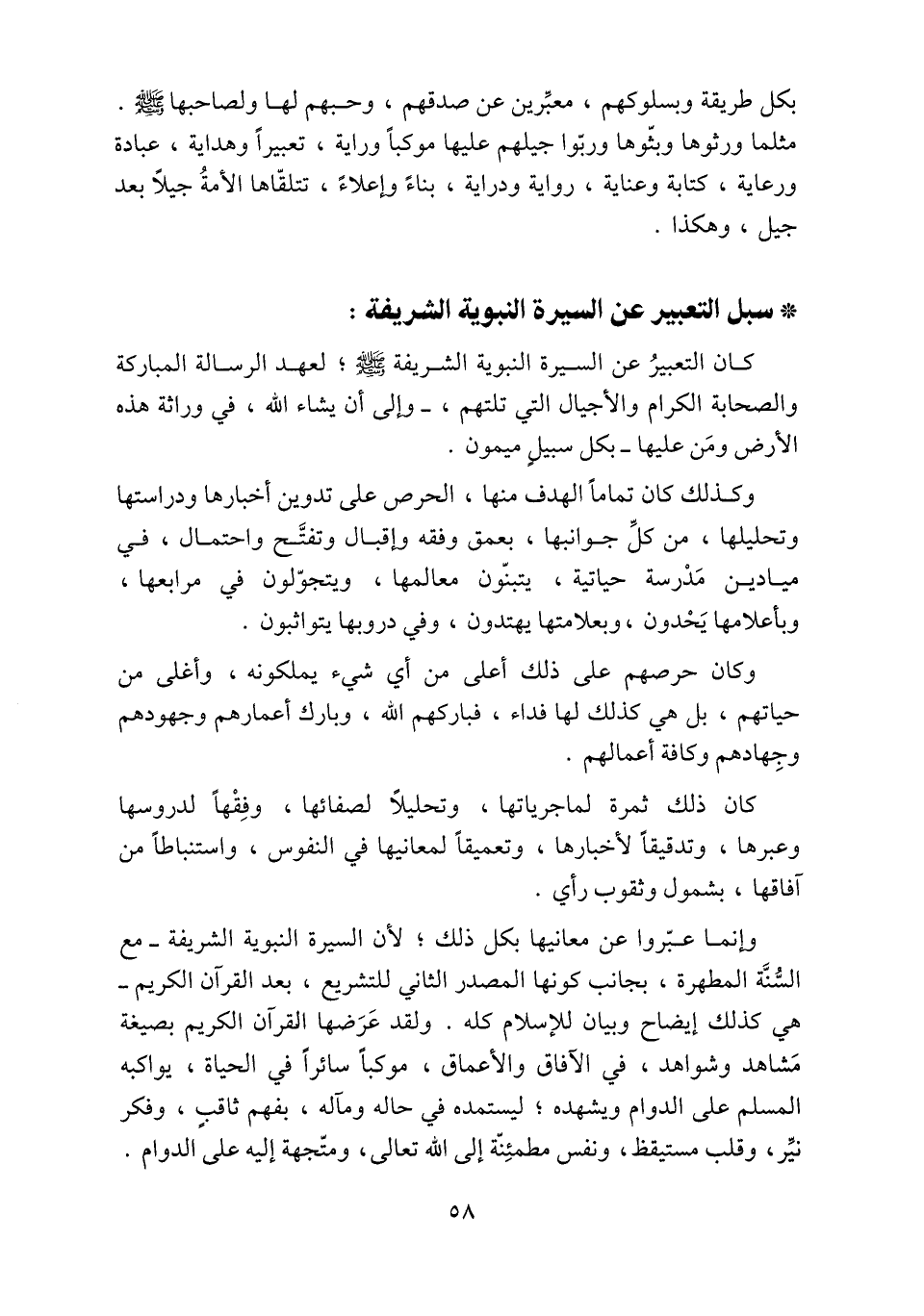 وإنما عبّروا عن معانيها بكل ذلك؛ لأن السيرة النبوية الشريفة- مع السّنّة المطهرة، بجانب كونها المصدر الثاني للتشريع، بعد القرآن الكريم- هي كذلك إيضاح وبيان للإسلام كله. ولقد عرضها القرآن الكريم بصيغة مشاهد وشواهد، في الآفاق والأعماق، موكبا سائرا في الحياة، يواكبه المسلم على الدوام ويشهده؛ ليستمده في حاله وماله، بفهم ثاقب، وفكر نيّر، وقلب مستيقظ، ونفس مطمئنّة إلى الله تعالى، ومتّجهة إليه على الدوام.