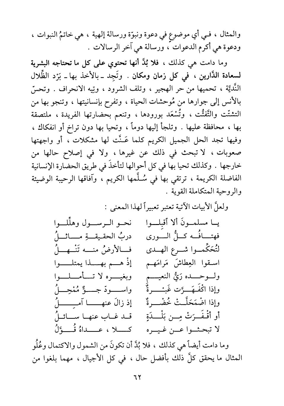 وما دامت هي كذلك، فلا بدّ أنها تحتوي على كل ما تحتاجه البشرية لسعادة الدّارين، في كل زمان ومكان. وتجد- بالأخذ بها- برد الظّلال النّديّة، تحميها من حر الهجير، وتلف الشرود، وتيه الانحراف. وتحسّ بالأنس إلى جوارها من موحشات الحياة، وتفرح بإنسانيتها، وتنجو بها من التشتّت والتّفتّت، وتسعد بورودها، وتنعم بحضارتها الفريدة، ملتصقة بها، محافظة عليها. وتلجأ إليها دوما، وتحيا بها دون تراخ أو انفكاك، وفيها تجد الحل الجميل الكريم كلما عنّت لها مشكلات، أو واجهتها صعوبات، لا تبحث في ذلك عن غيرها، ولا في إصلاح حالها من خارجها. وكذلك تحيا بها في كل أحوالها لتأخذ في طريق الحضارة الإنسانية الفاضلة الكريمة، ترتقي بها في سلّمها الكريم، وآفاقها الرحيبة الوضيئة والروحية المتكاملة القوية.