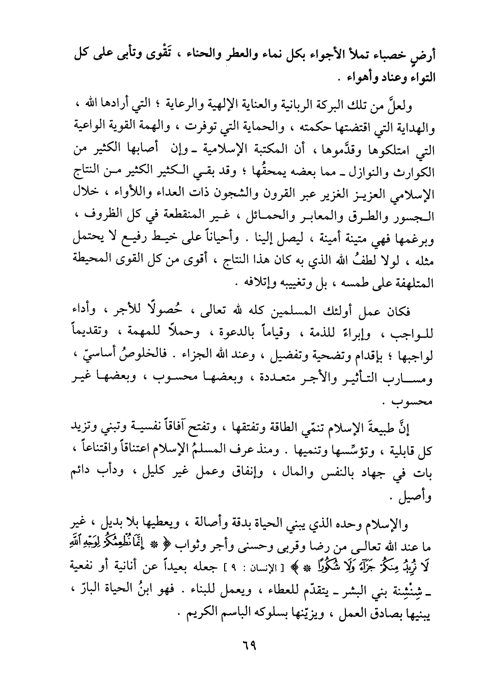والإسلام وحده الذي يا بني الحياة بدقة وأصالة، ويعطيها بلا بديل، غير ما عند الله تعالى من رضا وقربى وحسنى وأجر وثواب إِنَّما نُطْعِمُكُمْ لِوَجْهِ اللَّهِ لا نُرِيدُ مِنْكُمْ جَزاءً وَلا شُكُوراً [الإنسان: 9] جعله بعيدا عن أنانية أو نفعية شنشنة بني البشر- يتقدّم للعطاء، ويعمل للبناء. فهو ابن الحياة البارّ، يبنيها بصادق العمل، ويزيّنها بسلوكه الباسم الكريم.