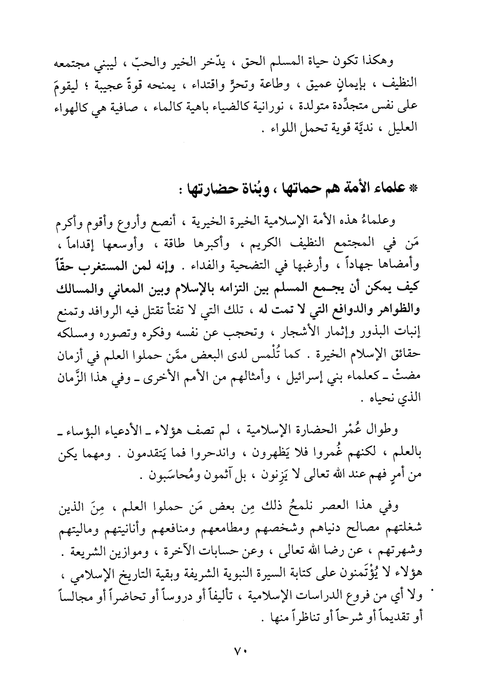 وعلماء هذه الأمة الإسلامية الخيرة الخيرية، أنصع وأروع وأقوم وأكرم من في المجتمع النظيف الكريم، وأكبرها طاقة، وأوسعها إقداما، وأمضاها جهادا، وأرغبها في التضحية والفداء. وإنه لمن المستغرب حقّا كيف يمكن أن يجمع المسلم بين التزامه بالإسلام وبين المعاني والمسالك والظواهر والدوافع التي لا تمت له، تلك التي لا تفتأ تقتل فيه الروافد وتمنع إنبات البذور وإثمار الأشجار، وتحجب عن نفسه وفكره وتصوره ومسلكه حقائق الإسلام الخيرة. كما تلمس لدى البعض ممّن حملوا العلم في أزمان مضت- كعلماء بني إسرائيل، وأمثالهم من الأمم الآخرى- وفي هذا الزّمان الذي نحياه.