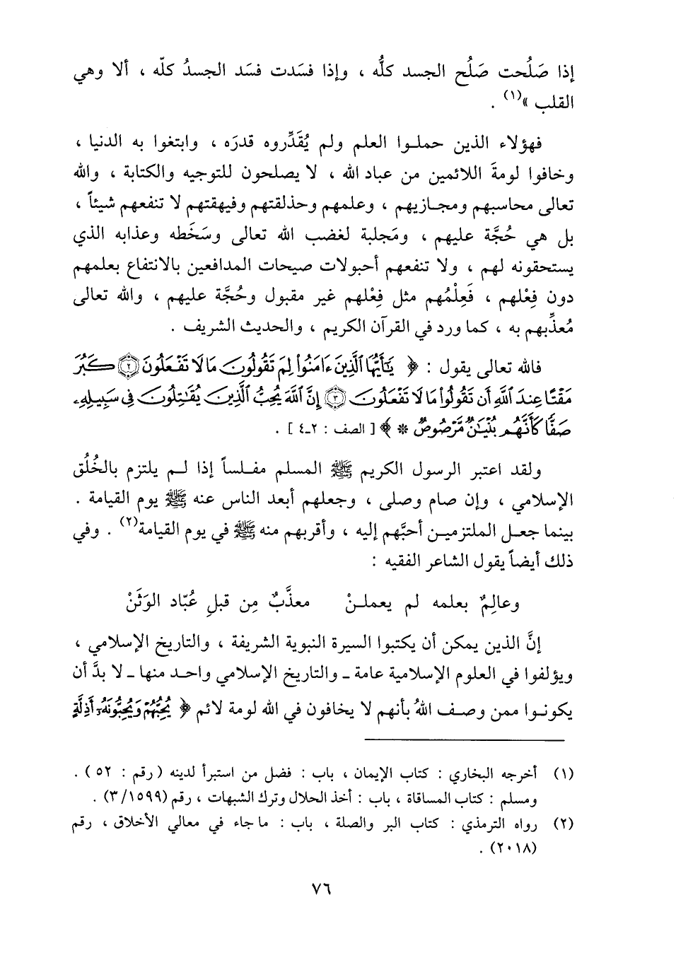 فالله تعالى يقول: يا أَيُّهَا الَّذِينَ آمَنُوا لِمَ تَقُولُونَ ما لا تَفْعَلُونَ (2) كَبُرَ مَقْتاً عِنْدَ اللَّهِ أَنْ تَقُولُوا ما لا تَفْعَلُونَ (3) إِنَّ اللَّهَ يُحِبُّ الَّذِينَ يُقاتِلُونَ فِي سَبِيلِهِ صَفًّا كَأَنَّهُمْ بُنْيانٌ مَرْصُوصٌ [الصف: 2- 4] .