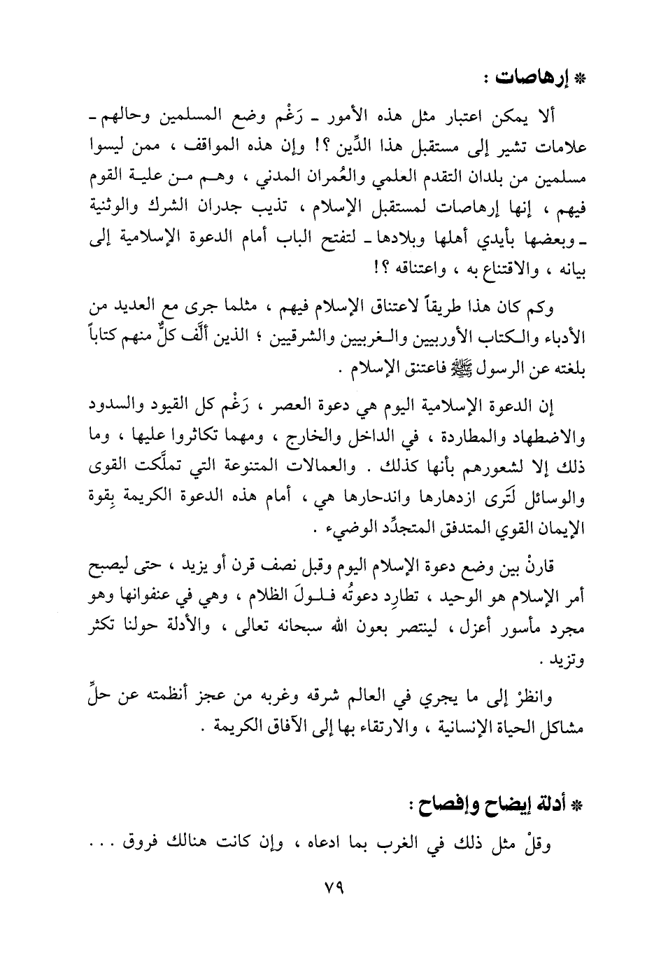 ألا يمكن اعتبار مثل هذه الأمور- رغم وضع المسلمين وحالهم- علامات تشير إلى مستقبل هذا الدّين؟! وإن هذه المواقف، ممن ليسوا مسلمين من بلدان التقدم العلمي والعمران المدني، وهم من علية القوم فيهم، إنها إرهاصات لمستقبل الإسلام، تذيب جدران الشرك والوثنية وبعضها بأيدي أهلها وبلادها- لتفتح الباب أمام الدعوة الإسلامية إلى بيانه، والاقتناع به، واعتناقه؟!