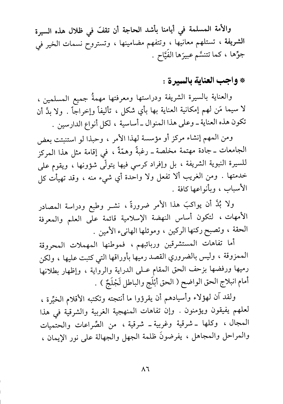 والعناية بالسيرة الشريفة ودراستها ومعرفتها مهمة جميع المسلمين، لا سيما من لهم إمكانية العناية بها بأي شكل، تأليفا وإخراجا. ولا بدّ أن تكون هذه العناية- وعلى هذا المنوال- أساسية، لكل أنواع الدارسين.