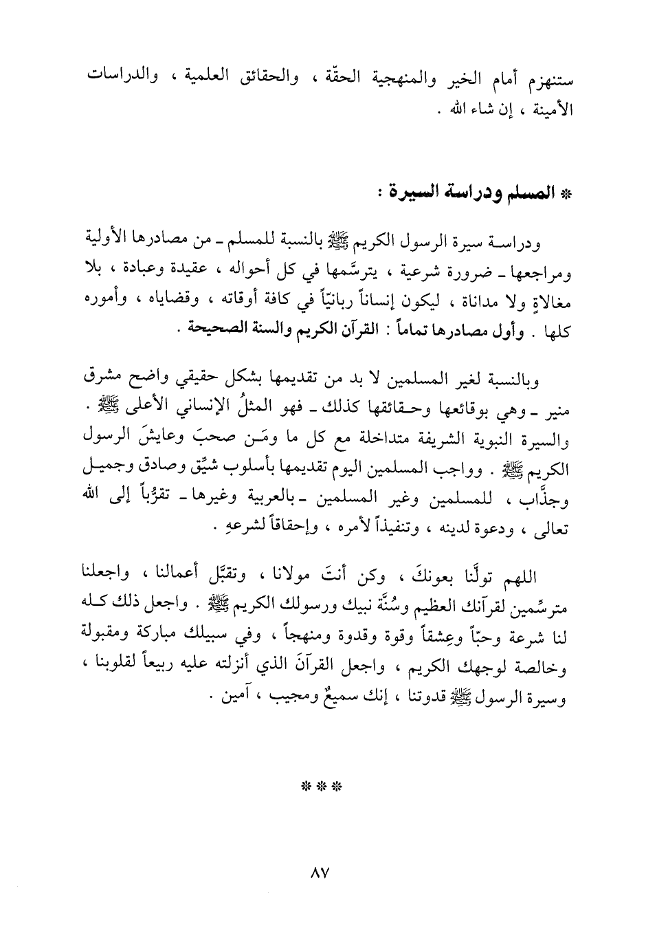 اللهم تولّنا بعونك، وكن أنت مولانا، وتقبّل أعمالنا، واجعلنا مترسّمين لقرآنك العظيم وسنّة نبيك ورسولك الكريم صلّى الله عليه وسلم. واجعل ذلك كله لنا شرعة وحبّا وعشقا وقوة وقدوة ومنهجا، وفي سبيلك مباركة ومقبولة وخالصة لوجهك الكريم، واجعل القرآن الذي أنزلته عليه ربيعا لقلوبنا، وسيرة الرسول صلّى الله عليه وسلّم قدوتنا، إنك سميع ومجيب، آمين.