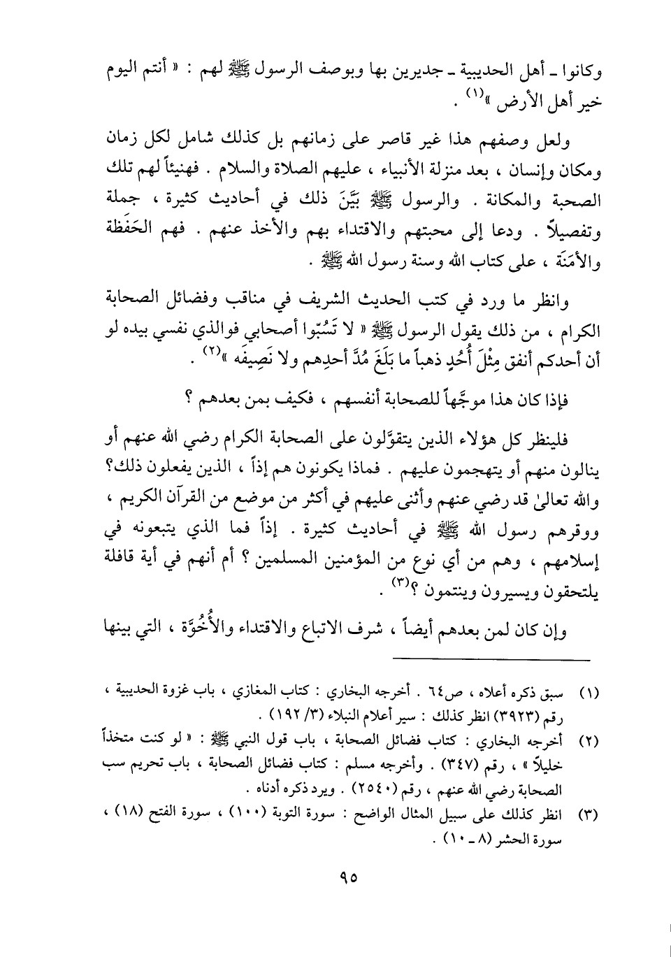 وانظر ما ورد في كتب الحديث الشريف في مناقب وفضائل الصحابة الكرام، من ذلك يقول الرسول صلى الله عليه وسلم «لا تسبّوا أصحابي فو الذي نفسي بيده لو أن أحدكم أنفق مثل أحد ذهبا ما بلغ مدّ أحدهم ولا نصيفه» «2» .