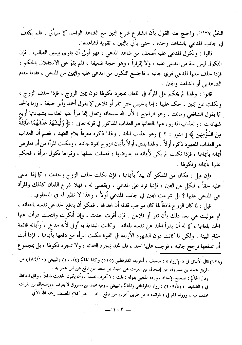 الْحَقِّ» ، وَاحْتَجَّ لِهَذَا الْقَوْلِ بِأَنَّ الشَّارِعَ شَرَعَ الْيَمِينَ مَعَ الشَّاهِدِ الْوَاحِدِ كَمَا سَيَأْتِي. فَلَمْ يَكْتَفِ فِي جَانِبِ الْمُدَّعِي بِالشَّاهِدِ وَحْدَهُ، حَتَّى يَأْتِيَ بِالْيَمِينِ، تَقْوِيَةً لِشَاهِدِهِ. قَالُوا: وَنُكُولُ الْمُدَّعَى عَلَيْهِ أَضْعَفُ مِنْ شَاهِدِ الْمُدَّعِي، فَهُوَ أَوْلَى أَنْ يُقَوَّى بِيَمِينِ الطَّالِبِ. فَإِنَّ النُّكُولَ لَيْسَ بَيِّنَةً مِنْ الْمُدَّعَى عَلَيْهِ، وَلَا إقْرَارًا، وَهُوَ حُجَّةٌ ضَعِيفَةٌ، فَلَمْ يَقْوَ عَلَى الِاسْتِقْلَالِ بِالْحُكْمِ، فَإِذَا حَلَفَ مَعَهَا الْمُدَّعِي قَوِيَ جَانِبُهُ، فَاجْتَمَعَ النُّكُولُ مِنْ الْمُدَّعَى عَلَيْهِ وَالْيَمِينُ مِنْ الْمُدَّعِي، فَقَامَا مَقَامَ الشَّاهِدَيْنِ أَوْ الشَّاهِدِ وَالْيَمِينِ. قَالُوا: وَلِهَذَا لَمْ يَحْكُمْ عَلَى الْمَرْأَةِ فِي اللِّعَانِ بِمُجَرَّدِ نُكُولِهَا دُونَ يَمِينِ الزَّوْجِ، فَإِذَا حَلَفَ الزَّوْجُ، وَنَكَلَتْ عَنْ الْيَمِينِ، حَكَمَ عَلَيْهَا: إمَّا بِالْحَبْسِ حَتَّى تُقِرَّ أَوْ تُلَاعَنَ كَمَا يَقُولُ أَحْمَدُ وَأَبُو حَنِيفَةَ، وَإِمَّا بِالْحَدِّ كَمَا يَقُولُ الشَّافِعِيُّ وَمَالِكٌ، وَهُوَ الرَّاجِحُ؛ لِأَنَّ اللَّهَ سُبْحَانَهُ وَتَعَالَى إنَّمَا دَرَأَ عَنْهَا الْعَذَابَ بِشَهَادَتِهَا أَرْبَعُ شَهَادَاتٍ: وَالْعَذَابُ الْمَدْرُوءُ عَنْهَا بِالْتِعَانِهَا هُوَ الْعَذَابُ الْمَذْكُورُ فِي قَوْله تَعَالَى: {وَلْيَشْهَدْ عَذَابَهُمَا طَائِفَةٌ مِنَ الْمُؤْمِنِينَ} [النور: 2] وَهُوَ عَذَابُ الْحَدِّ. وَلِهَذَا ذَكَرَهُ مُعَرَّفًا فَاللَّامُ الْعَهْدِ، فَعُلِمَ أَنَّ الْعَذَابَ هُوَ الْعَذَابُ الْمَعْهُودُ ذِكْرُهُ أَوَّلًا. وَلِهَذَا بُدِئَ أَوَّلًا بِأَيْمَانِ الزَّوْجِ لِقُوَّةِ جَانِبِهِ، وَمُكِّنَتْ الْمَرْأَةُ مِنْ أَنْ تُعَارِضَ إيمَانَهُ بِأَيْمَانِهَا، فَإِذَا نَكَلَتْ لَمْ يَكُنْ لِأَيْمَانِهِ مَا يُعَارِضُهَا، فَعَمِلَتْ عَمَلَهَا، وَقَوَّاهَا نُكُولُ الْمَرْأَةِ، فَحَكَمَ عَلَيْهَا بِأَيْمَانِهِ وَنُكُولِهَا. فَإِنْ قِيلَ: فَكَانَ مِنْ الْمُمْكِنِ أَنْ يَبْدَأَ بِأَيْمَانِهَا، فَإِنْ نَكَلَتْ حَلَفَ الزَّوْجُ وَحُدَّتْ، كَمَا إذَا ادَّعَى عَلَيْهِ حَقًّا، فَنَكَلَ عَنْ الْيَمِينِ، فَإِنَّهَا تُرَدُّ عَلَى الْمُدَّعِي، وَيَقْضِي لَهُ، فَهَلَّا شُرِعَ اللِّعَانُ كَذَلِكَ وَالْمَرْأَةُ هِيَ الْمُدَّعَى عَلَيْهَا؟ بَلْ شُرِعَتْ الْيَمِينُ فِي جَانِبِ الْمُدَّعِي أَوَّلًا، وَهَذَا لَا نَظِيرَ لَهُ فِي الدَّعَاوَى.