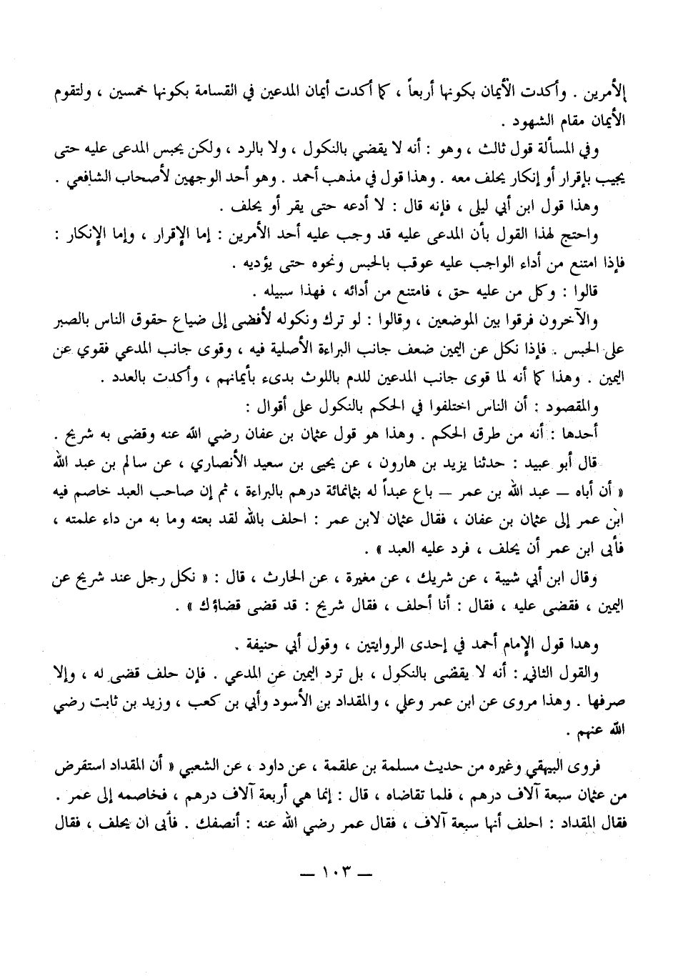 فَرَوَى الْبَيْهَقِيّ وَغَيْرُهُ مِنْ حَدِيثِ مَسْلَمَةَ بْنِ عَلْقَمَةَ، عَنْ دَاوُد، عَنْ الشَّعْبِيِّ " أَنَّ الْمِقْدَادَ اسْتَقْرَضَ مِنْ عُثْمَانَ سَبْعَةَ آلَافِ دِرْهَمٍ، فَلَمَّا تَقَاضَاهُ، قَالَ: إنَّمَا هِيَ أَرْبَعَةُ آلَافِ دِرْهَمٍ، فَخَاصَمَهُ إلَى عُمَرَ. فَقَالَ الْمِقْدَادُ: أَحْلِفُ أَنَّهَا سَبْعَةُ آلَافٍ، فَقَالَ عُمَرُ - رَضِيَ اللَّهُ عَنْهُ -: أُنْصِفُكَ. فَأَبَى أَنْ يَحْلِفَ، فَقَالَ
