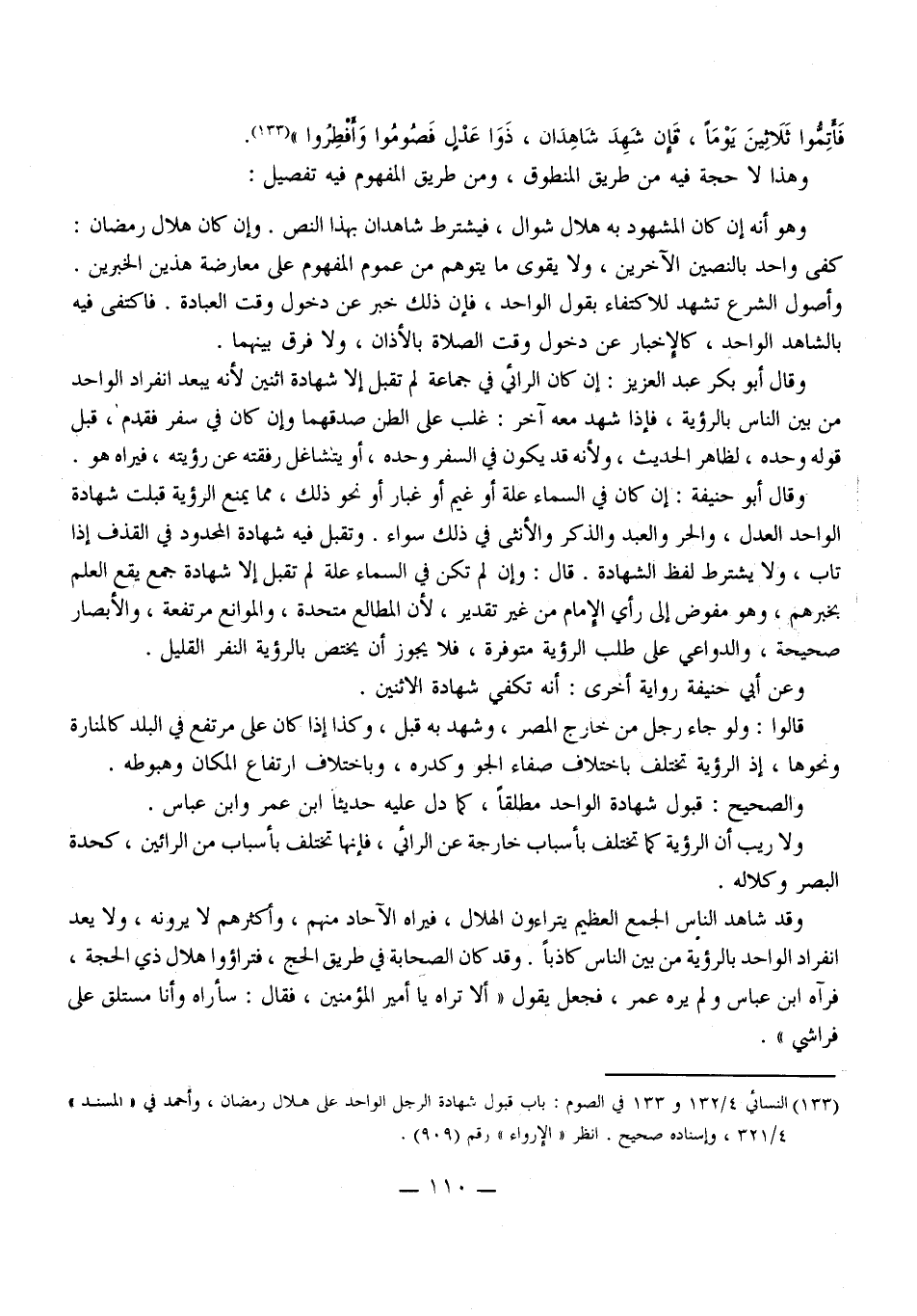 وَهَذَا لَا حُجَّةَ فِيهِ مِنْ طَرِيقِ الْمَنْطُوقِ، وَمِنْ طَرِيقِ الْمَفْهُومِ فِيهِ تَفْصِيلٌ: وَهُوَ أَنَّهُ إنْ كَانَ الْمَشْهُودُ بِهِ هِلَالُ شَوَّالٍ، فَيُشْتَرَطُ شَاهِدَانِ بِهَذَا النَّصِّ. وَإِنْ كَانَ هِلَالُ رَمَضَانَ: كَفَى وَاحِدٌ بِالنَّصَّيْنِ الْآخَرَيْنِ، وَلَا يَقْوَى مَا يُتَوَهَّمُ مِنْ عُمُومِ الْمَفْهُومِ عَلَى مُعَارَضَةِ هَذَيْنِ الْخَبَرَيْنِ. وَأُصُولُ الشَّرْعِ تَشْهَدُ لِلِاكْتِفَاءِ بِقَوْلِ الْوَاحِدِ، فَإِنَّ ذَلِكَ خَبَرٌ عَنْ دُخُولِ وَقْتِ الْعِبَادَةِ. فَاكْتَفَى فِيهِ بِالشَّاهِدِ الْوَاحِدِ، كَالْإِخْبَارِ عَنْ دُخُولِ وَقْتِ الصَّلَاةِ بِالْأَذَانِ، وَلَا فَرْقَ بَيْنَهُمَا.