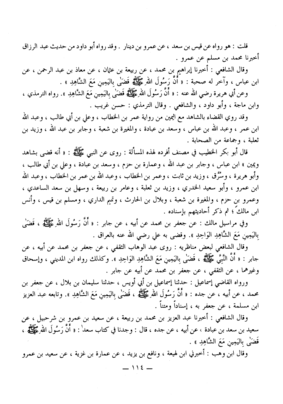 وَقَدْ رُوِيَ الْقَضَاءُ بِالشَّاهِدِ مَعَ الْيَمِينِ مِنْ رِوَايَةِ عُمَرَ بْنِ الْخَطَّابِ، وَعَلِيِّ بْنِ أَبِي طَالِبٍ، وَعَبْدِ اللَّهِ بْنِ عُمَرَ، وَعَبْدِ اللَّهِ بْنِ عَبَّاسٍ، وَسَعْدِ بْنِ عُبَادَةَ، وَالْمُغِيرَةِ بْنِ شُعْبَةَ، وَجَابِرِ بْنِ عَبْدِ اللَّهِ، وَزَيْدِ بْنِ ثَعْلَبَةَ، وَجَمَاعَةٍ مِنْ الصَّحَابَةِ. قَالَ أَبُو بَكْرٍ الْخَطِيبُ فِي مُصَنَّفٍ أَفْرَدَهُ لِهَذِهِ الْمَسْأَلَةِ: رَوَى «عَنْ النَّبِيِّ - صَلَّى اللَّهُ عَلَيْهِ وَسَلَّمَ -: أَنَّهُ قَضَى بِشَاهِدٍ وَيَمِينٍ» ابْنُ عَبَّاسٍ، وَجَابِرُ بْنُ عَبْدِ اللَّهِ، وَعُمَارَةُ بْنُ حَزْمٍ، وَسَعْدُ بْنُ عُبَادَةَ، وَعَلِيُّ بْنُ أَبِي طَالِبٍ، وَأَبُو هُرَيْرَةَ، وَسُرَّقٌ، وَزَيْدُ بْنُ ثَابِتٍ، وَعُمَرُ بْنُ الْخَطَّابِ، وَعَبْدُ اللَّهِ بْنُ عُمَرَ بْنُ الْخَطَّابِ، وَعَبْدُ اللَّهِ بْنُ عَمْرٍو، وَأَبُو سَعِيدٍ الْخُدْرِيُّ، وَزَيْدُ بْنُ ثَعْلَبَةَ، وَعَامِرُ بْنُ رَبِيعَةَ، وَسَهْلُ بْنُ سَعْدٍ السَّاعِدِيُّ، وَعَمْرُو بْنُ حَزْمٍ، وَالْمُغِيرَةُ بْنُ شُعْبَةَ، وَبِلَالُ بْنُ الْحَارِثِ، وَتَمِيمٌ الدَّارِيُّ، وَمُسْلِمُ بْنُ قَيْسٍ، وَأَنَسُ بْنُ مَالِكٍ؛ ثُمَّ ذَكَرَ أَحَادِيثَهُمْ بِإِسْنَادِهِ. وَفِي مَرَاسِيلِ مَالِكٍ: عَنْ جَعْفَرِ بْنِ مُحَمَّدٍ عَنْ أَبِيهِ، عَنْ جَابِرٍ: «أَنَّ رَسُولَ اللَّهِ - صَلَّى اللَّهُ عَلَيْهِ وَسَلَّمَ - قَضَى بِالْيَمِينِ مَعَ الشَّاهِدِ الْوَاحِدِ» .