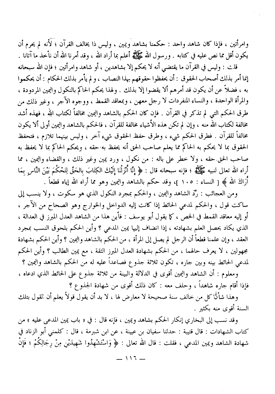 وَامْرَأَتَيْنِ، فَإِذَا كَانَ شَاهِدٌ وَاحِدٌ: حَكَمْنَا بِشَاهِدٍ وَيَمِينٍ، وَلَيْسَ ذَا يُخَالِفُ الْقُرْآنَ؛ لِأَنَّهُ لَمْ يَحْرُمْ أَنْ يَكُونَ أَقَلَّ مِمَّا نَصَّ عَلَيْهِ فِي كِتَابِهِ. وَرَسُولُ اللَّهِ - صَلَّى اللَّهُ عَلَيْهِ وَسَلَّمَ - أَعْلَمُ بِمَا أَرَادَ اللَّهُ، وَقَدْ أَمَرَنَا اللَّهُ أَنْ نَأْخُذَ مَا آتَانَا. قُلْتُ: وَلَيْسَ فِي الْقُرْآنِ مَا يَقْتَضِي أَنَّهُ لَا يَحْكُمُ إلَّا بِشَاهِدَيْنِ، أَوْ شَاهِدٍ وَامْرَأَتَيْنِ؛ فَإِنَّ اللَّهَ سُبْحَانَهُ إنَّمَا أَمَرَ بِذَلِكَ أَصْحَابَ الْحُقُوقِ: أَنْ يَحْفَظُوا حُقُوقَهُمْ بِهَذَا النِّصَابِ، وَلَمْ يَأْمُرْ بِذَلِكَ الْحُكَّامَ: أَنْ يَحْكُمُوا بِهِ، فَضْلًا عَنْ أَنْ يَكُونَ قَدْ أَمَرَهُمْ أَلَّا يَقْضُوا إلَّا بِذَلِكَ. وَلِهَذَا يَحْكُمُ الْحَاكِمُ بِالنُّكُولِ وَالْيَمِينِ الْمَرْدُودَةِ، وَالْمَرْأَةِ الْوَاحِدَةِ، وَالنِّسَاءِ الْمُنْفَرِدَاتِ لَا رَجُلَ مَعَهُنَّ، وَبِمَعَاقِدِ الْقِمْطِ، وَوُجُوهِ الْآجِرِ، وَغَيْرِ ذَلِكَ مِنْ طُرُقِ الْحُكْمِ الَّتِي لَمْ تُذْكَرْ فِي الْقُرْآنِ. فَإِنْ كَانَ الْحُكْمُ بِالشَّاهِدِ وَالْيَمِينِ مُخَالِفًا لِكِتَابِ اللَّهِ، فَهَذِهِ أَشَدُّ مُخَالَفَةً لِكِتَابِ اللَّهِ مِنْهُ، وَإِنْ لَمْ تَكُنْ هَذِهِ الْأَشْيَاءُ مُخَالِفَةً لِلْقُرْآنِ، فَالْحُكْمُ بِالشَّاهِدِ وَالْيَمِينِ أَوْلَى أَلَّا يَكُونَ مُخَالِفًا لِلْقُرْآنِ. فَطُرُقُ الْحُكْمِ شَيْءٌ، وَطُرُقُ حِفْظِ الْحُقُوقِ شَيْءٌ آخَرُ، وَلَيْسَ بَيْنَهُمَا تَلَازُمٌ، فَتُحْفَظُ الْحُقُوقُ بِمَا لَا يَحْكُمُ بِهِ الْحَاكِمُ مِمَّا يَعْلَمُ صَاحِبُ الْحَقِّ أَنَّهُ يَحْفَظُ بِهِ حَقَّهُ، وَيْحُكُمْ الْحَاكِمُ بِمَا لَا يَحْفَظُ بِهِ صَاحِبُ الْحَقِّ حَقَّهُ، وَلَا خَطَرَ عَلَى بَالِهِ: مِنْ نُكُولٍ، وَرَدِّ يَمِينٍ وَغَيْرِ ذَلِكَ، وَالْقَضَاءُ وَالْيُمْنُ، مِمَّا أَرَاهُ اللَّهُ تَعَالَى لِنَبِيِّهِ - صَلَّى اللَّهُ عَلَيْهِ وَسَلَّمَ -؛ فَإِنَّهُ سُبْحَانَهُ قَالَ: {إِنَّا أَنْزَلْنَا إِلَيْكَ الْكِتَابَ بِالْحَقِّ لِتَحْكُمَ بَيْنَ النَّاسِ بِمَا أَرَاكَ اللَّهُ} [النساء: 105] ، وَقَدْ حَكَمَ بِالشَّاهِدِ وَالْيَمِينِ وَهُوَ مِمَّا أَرَاهُ اللَّهُ إيَّاهُ قَطْعًا.