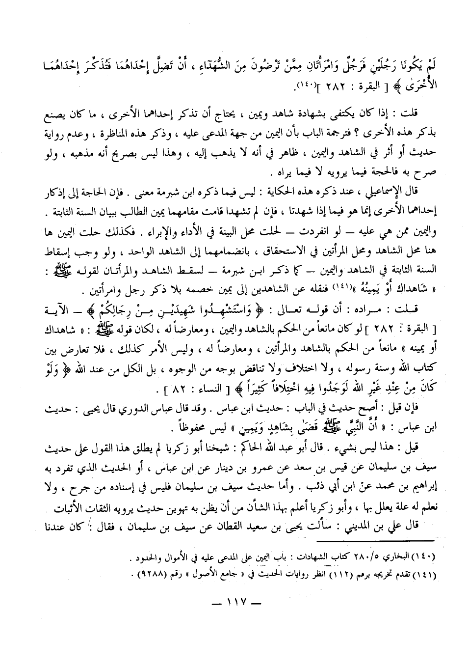 قُلْتُ: مُرَادُهُ: أَنَّ قَوْله تَعَالَى: {وَاسْتَشْهِدُوا شَهِيدَيْنِ مِنْ رِجَالِكُمْ} [البقرة: 282]- الْآيَةَ لَوْ كَانَ مَانِعًا مِنْ الْحُكْمِ بِالشَّاهِدِ وَالْيَمِينِ، وَمُعَارِضًا لَهُ، لَكَانَ قَوْلُهُ - صَلَّى اللَّهُ عَلَيْهِ وَسَلَّمَ -: «شَاهِدَاكَ أَوْ يَمِينُهُ» مَانِعًا مِنْ الْحُكْمِ بِالشَّاهِدِ وَالْمَرْأَتَيْنِ، وَمُعَارِضًا لَهُ، وَلَيْسَ الْأَمْرُ كَذَلِكَ، فَلَا تَعَارُضَ بَيْنَ كِتَابِ اللَّهِ وَسُنَّةِ رَسُولِهِ، وَلَا اخْتِلَافَ وَلَا تَنَاقُضَ بِوَجْهٍ مِنْ الْوُجُوهِ، بَلْ الْكُلُّ مِنْ عِنْدِ اللَّهِ {وَلَوْ كَانَ مِنْ عِنْدِ غَيْرِ اللَّهِ لَوَجَدُوا فِيهِ اخْتِلافًا كَثِيرًا} [النساء: 82] . فَإِنْ قِيلَ: أَصَحُّ حَدِيثٍ فِي الْبَابِ: حَدِيثُ ابْنِ عَبَّاسٍ.