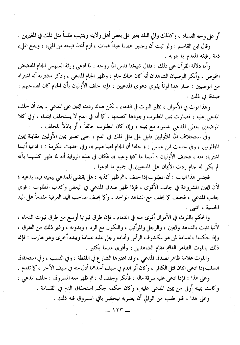 وَقَالَ ابْنُ الْقَاسِمِ: وَلَوْ ثَبَتَ أَنَّ رَجُلَيْنِ غَصَبَا عَبْدًا فَمَاتَ، لَزِمَ أَخْذُ قِيمَتِهِ مِنْ الْمَلِيءِ، وَيَتْبَعُ الْمَلِيءُ ذِمَّةَ رَفِيقِهِ الْمُعْدِمِ بِمَا يَنُوبُهُ. وَأَمَّا دَلَالَةُ الْقُرْآنِ عَلَى ذَلِكَ: فَقَالَ شَيْخُنَا قَدَّسَ اللَّهُ رُوحَهُ: لَمَّا ادَّعَى وَرَثَةُ السَّهْمِيِّ الْجَامَ الْمُفَضَّضَ الْمُخَوَّصَ، وَأَنْكَرَ الْوَصِيَّانِ الشَّاهِدَانِ أَنَّهُ كَانَ هُنَاكَ جَامٌ، وَظَهَرَ الْجَامُ الْمُدَّعَى، وَذَكَرَ مُشْتَرِيهِ أَنَّهُ اشْتَرَاهُ مِنْ الْوَصِيَّيْنِ: صَارَ هَذَا لَوْثًا يُقَوِّي دَعْوَى الْمُدَّعِيَيْنِ، فَإِذَا حَلَفَ الْأَوْلَيَانِ بِأَنَّ الْجَامَ كَانَ لِصَاحِبِهِمْ: صُدِّقَا فِي ذَلِكَ. وَهَذَا لَوْثٌ فِي الْأَمْوَالِ، نَظِيرُ اللَّوْثِ فِي الدِّمَاءِ، لَكِنْ هُنَاكَ رُدَّتْ الْيَمِينُ عَلَى الْمُدَّعِي، بَعْدَ أَنْ حَلَفَ الْمُدَّعَى عَلَيْهِ، فَصَارَتْ يَمِينُ الْمَطْلُوبِ وُجُودُهَا كَعَدَمِهَا، كَمَا أَنَّهُ فِي الدَّمِ لَا يُسْتَحْلَفُ ابْتِدَاءً، وَفِي كِلَا الْمَوْضِعَيْنِ يُعْطَى الْمُدَّعِي بِدَعْوَاهُ مَعَ يَمِينِهِ، وَإِنْ كَانَ الْمَطْلُوبُ حَالِفًا، أَوْ بَاذِلًا لِلْحَلِفِ.