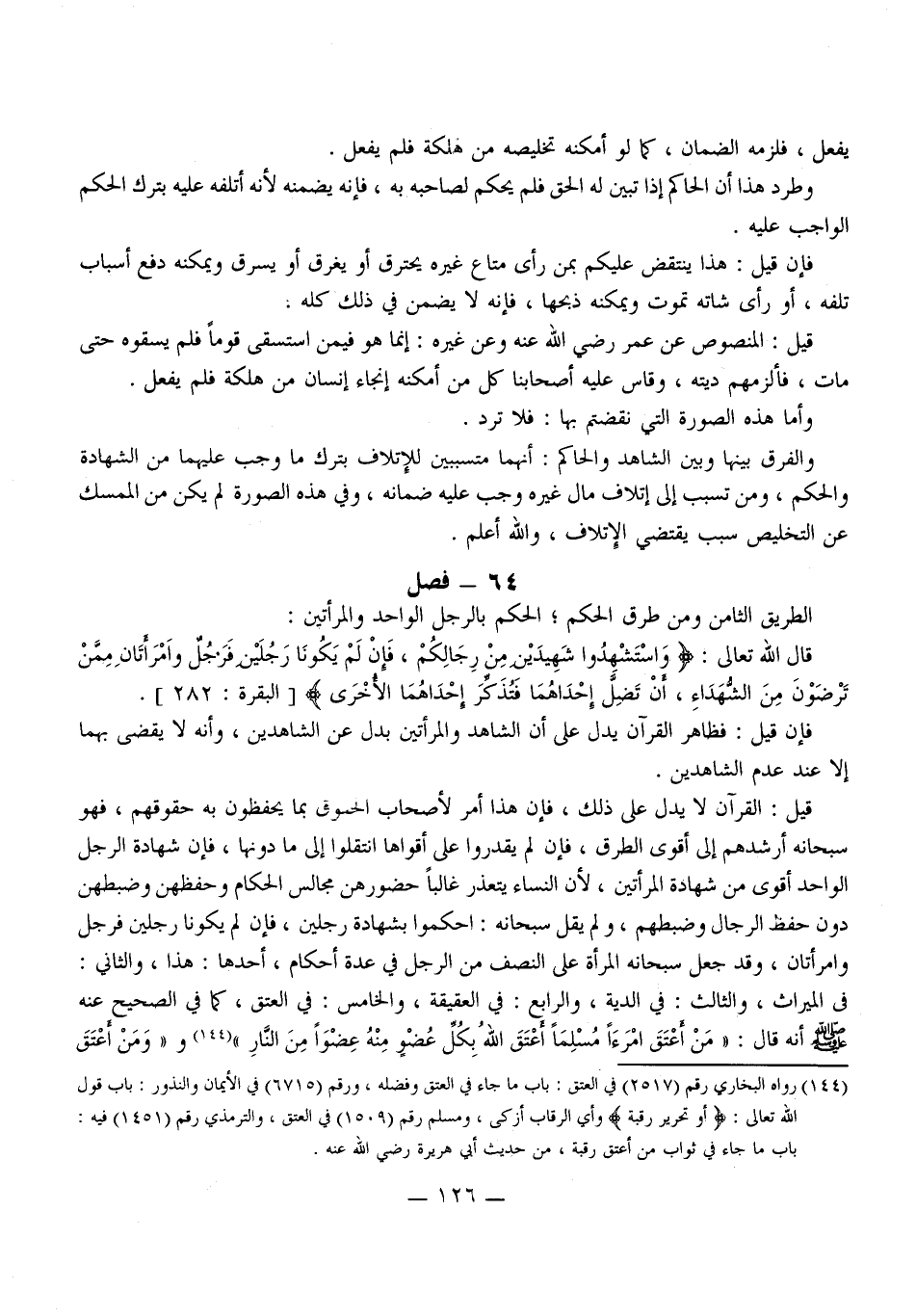 يَفْعَلْ، فَلَزِمَهُ الضَّمَانُ، كَمَا لَوْ أَمْكَنَهُ تَخْلِيصُهُ مِنْ هَلَكَةٍ فَلَمْ يَفْعَلْ. وَطَرْدُ هَذَا أَنَّ الْحَاكِمَ إذَا تَبَيَّنَ لَهُ الْحَقُّ فَلَمْ يَحْكُمْ لِصَاحِبِهِ بِهِ، فَإِنَّهُ يَضْمَنُهُ لِأَنَّهُ أَتْلَفَهُ عَلَيْهِ بِتَرْكِ الْحُكْمِ الْوَاجِبِ عَلَيْهِ. فَإِنْ قِيلَ: هَذَا يُنْتَقَضُ عَلَيْكُمْ بِمَنْ رَأَى مَتَاعَ غَيْرِهِ يَحْتَرِقُ أَوْ يَغْرَقُ أَوْ يُسْرَقُ وَيُمْكِنُهُ دَفْعُ أَسْبَابِ تَلَفِهِ، أَوْ رَأَى شَاتَهُ تَمُوتُ وَيُمْكِنُهُ ذَبْحُهَا، فَإِنَّهُ لَا يَضْمَنُ فِي ذَلِكَ كُلِّهِ.
