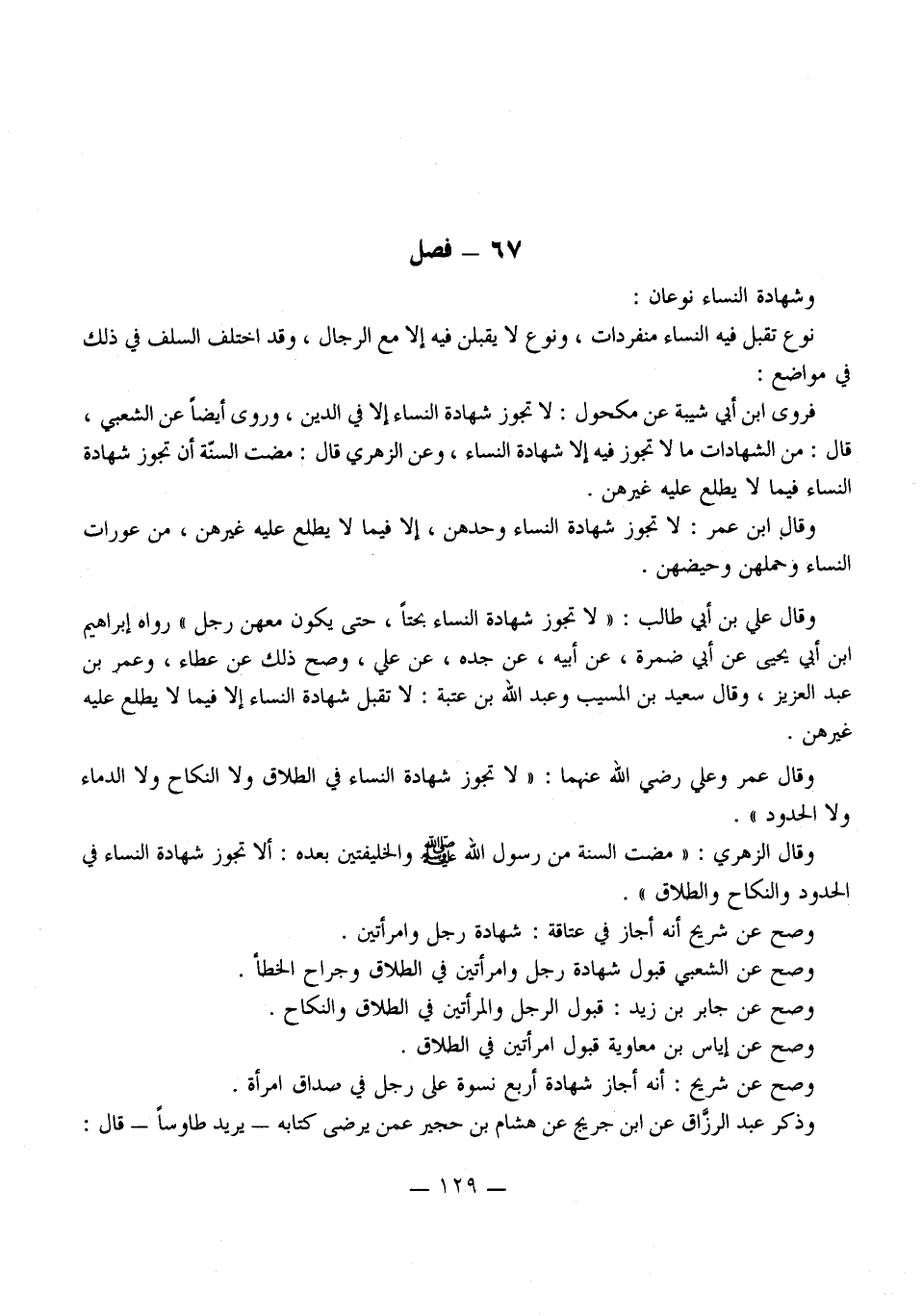 وَشَهَادَةُ النِّسَاءِ نَوْعَانِ: نَوْعٌ تُقْبَلُ فِيهِ النِّسَاءُ مُنْفَرِدَاتٍ، وَنَوْعٌ لَا يُقْبَلْنَ فِيهِ إلَّا مَعَ الرِّجَالِ، وَقَدْ اخْتَلَفَ السَّلَفُ فِي ذَلِكَ فِي مَوَاضِعَ: فَرَوَى ابْنُ أَبِي شَيْبَةَ عَنْ مَكْحُولٍ: لَا تَجُوزُ شَهَادَةُ النِّسَاءِ إلَّا فِي الدَّيْنِ، وَرَوَى أَيْضًا عَنْ الشَّعْبِيِّ، قَالَ: مِنْ الشَّهَادَاتِ مَا لَا تَجُوزُ فِيهِ إلَّا شَهَادَةَ النِّسَاءِ، وَعَنْ الزُّهْرِيِّ قَالَ: مَضَتْ السُّنَّةُ أَنْ تَجُوزَ شَهَادَةُ النِّسَاءِ فِيمَا لَا يَطَّلِعُ عَلَيْهِ غَيْرُهُنَّ.