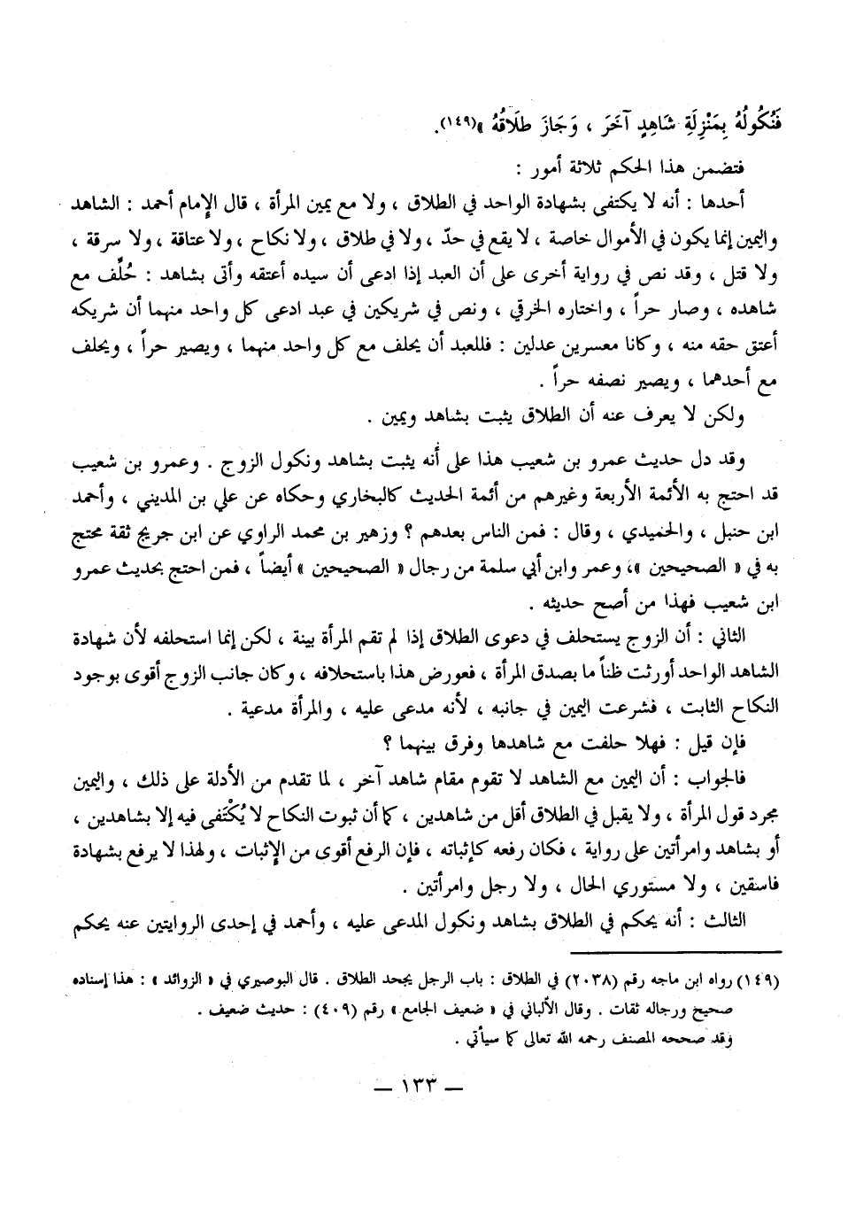 فَنُكُولُهُ بِمَنْزِلَةِ شَاهِدٍ آخَرَ، وَجَازَ طَلَاقُهُ» . فَتَضَمَّنَ هَذَا الْحُكْمُ ثَلَاثَةَ أُمُورٍ: أَحَدُهَا: أَنَّهُ لَا يُكْتَفَى بِشَهَادَةِ الْوَاحِدِ فِي الطَّلَاقِ، وَلَا مَعَ يَمِينِ الْمَرْأَةِ.