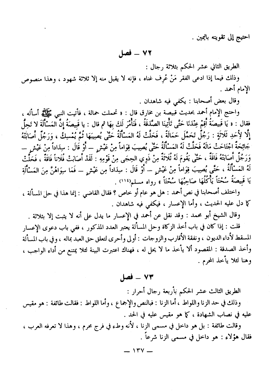 الطَّرِيقُ الثَّانِيَ عَشَرَ الْحُكْمُ بِثَلَاثَةِ رِجَالٍ: وَذَلِكَ فِيمَا إذَا ادَّعَى الْفَقْرَ مَنْ عُرِفَ غِنَاهُ، فَإِنَّهُ لَا يُقْبَلُ مِنْهُ إلَّا ثَلَاثَةُ شُهُودٍ، وَهَذَا مَنْصُوصُ الْإِمَامِ أَحْمَدَ.