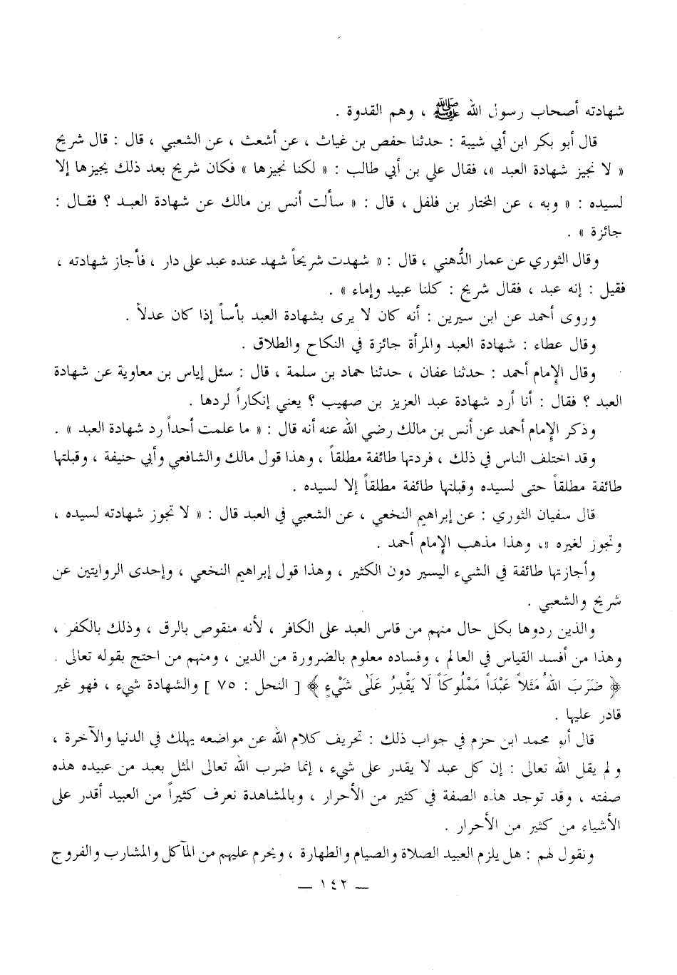 وَاَلَّذِينَ رَدُّوهَا بِكُلِّ حَالٍ مِنْهُمْ مَنْ قَاسَ الْعَبْدَ عَلَى الْكَافِرِ، لِأَنَّهُ مَنْقُوصٌ بِالرِّقِّ، وَذَلِكَ بِالْكُفْرِ، وَهَذَا مِنْ أَفْسَدِ الْقِيَاسِ فِي الْعَالَمِ، وَفَسَادُهُ مَعْلُومٌ بِالضَّرُورَةِ مِنْ الدِّينِ، وَمِنْهُمْ مَنْ احْتَجَّ بِقَوْلِهِ تَعَالَى {ضَرَبَ اللَّهُ مَثَلا عَبْدًا مَمْلُوكًا لا يَقْدِرُ عَلَى شَيْءٍ} [النحل: 75] وَالشَّهَادَةُ شَيْءٌ، فَهُوَ غَيْرُ قَادِرٍ عَلَيْهَا.