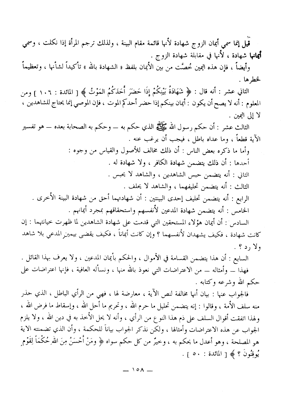 الثَّالِثَ عَشَرَ: أَنَّ حُكْمَ رَسُولِ اللَّهِ - صَلَّى اللَّهُ عَلَيْهِ وَسَلَّمَ - الَّذِي حَكَمَ بِهِ - وَحَكَمَ بِهِ الصَّحَابَةُ بَعْدَهُ - هُوَ تَفْسِيرُ الْآيَةِ قَطْعًا، وَمَا عَدَاهُ بَاطِلٌ، فَيَجِبُ أَنْ يُرْغَبَ عَنْهُ. أَمَّا مَا ذَكَرَهُ بَعْضُ النَّاسِ: أَنَّ ذَلِكَ مُخَالِفٌ لِلْأُصُولِ وَالْقِيَاسِ مِنْ وُجُوهٍ: أَحَدُهَا: أَنَّ ذَلِكَ يَتَضَمَّنُ شَهَادَةَ الْكَافِرِ، وَلَا شَهَادَةَ لَهُ.
