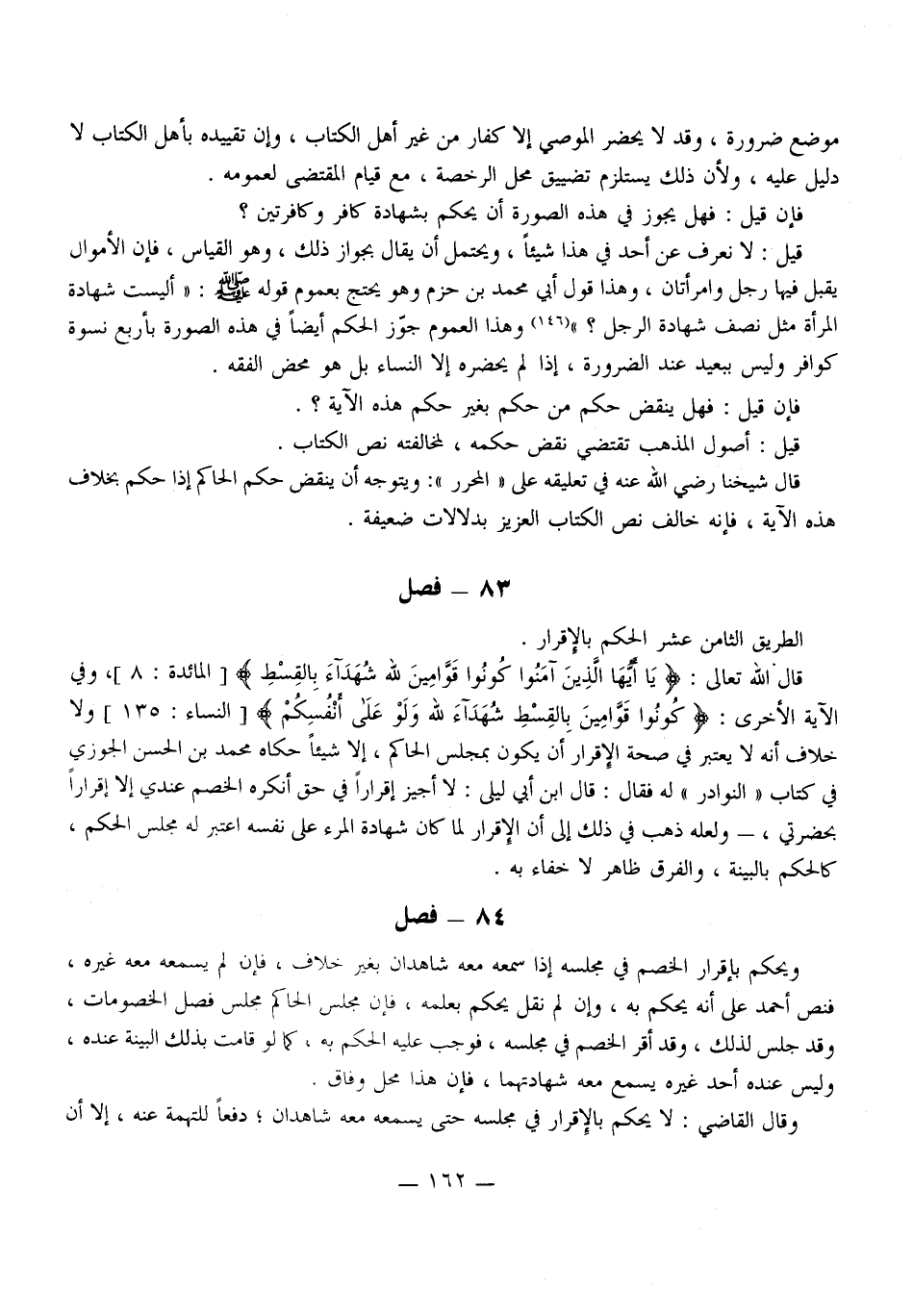 فَإِنْ قِيلَ: فَهَلْ يَجُوزُ فِي هَذِهِ الصُّورَةِ أَنْ يَحْكُمَ بِشَهَادَةِ كَافِرٍ وَكَافِرَتَيْنِ؟ قِيلَ: لَا نَعْرِفُ عَنْ أَحَدٍ فِي هَذَا شَيْئًا، وَيُحْتَمَلُ أَنْ يُقَالَ بِجَوَازِ ذَلِكَ، وَهُوَ الْقِيَاسُ، فَإِنَّ الْأَمْوَالَ يُقْبَلُ فِيهَا رَجُلٌ وَامْرَأَتَانِ، وَهَذَا قَوْلُ أَبِي مُحَمَّدِ بْنِ حَزْمٍ وَهُوَ يَحْتَجُّ بِعُمُومِ قَوْلِهِ - صَلَّى اللَّهُ عَلَيْهِ وَسَلَّمَ -: «أَلَيْسَتْ شَهَادَةُ الْمَرْأَةِ مِثْلَ نِصْفِ شَهَادَةِ الرَّجُلِ؟» (146) وَهَذَا الْعُمُومُ جَوَّزَ الْحُكْمَ أَيْضًا فِي هَذِهِ الصُّورَةِ بِأَرْبَعِ نِسْوَةٍ كَوَافِرَ وَلَيْسَ بِبَعِيدٍ عِنْدَ الضَّرُورَةِ، إذَا لَمْ يَحْضُرْهُ إلَّا النِّسَاءُ بَلْ هُوَ مَحْضُ الْفِقْهِ. فَإِنْ قِيلَ: فَهَلْ يُنْقَضُ حُكْمُ مَنْ حَكَمَ بِغَيْرِ حُكْمِ هَذِهِ الْآيَةِ؟ . قِيلَ: أُصُولُ الْمَذْهَبِ تَقْتَضِي نَقْضَ حُكْمِهِ، لِمُخَالَفَتِهِ نَصَّ الْكِتَابِ.