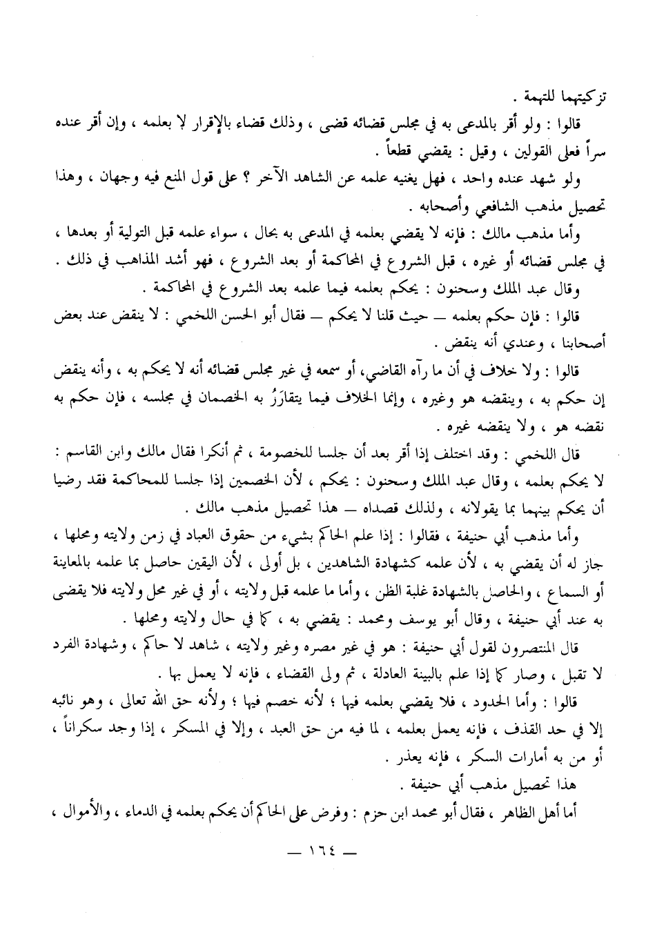 وَقَالَ عَبْدُ الْمَلِكِ وَسَحْنُونٌ: يَحْكُمُ بِعِلْمِهِ فِيمَا عَلِمَهُ بَعْدَ الشُّرُوعِ فِي الْمُحَاكَمَةِ. قَالُوا: فَإِنْ حُكِمَ بِعِلْمِهِ - حَيْثُ قُلْنَا لَا يَحْكُمُ - فَقَالَ أَبُو الْحَسَنِ اللَّخْمِيُّ: لَا يُنْقَضُ عِنْدَ بَعْضِ أَصْحَابِنَا، وَعِنْدِي أَنَّهُ يُنْقَضُ. قَالُوا: وَلَا خِلَافَ فِي أَنَّ مَا رَآهُ الْقَاضِي، أَوْ سَمِعَهُ فِي غَيْرِ مَجْلِسِ قَضَائِهِ أَنَّهُ لَا يَحْكُمُ بِهِ، وَأَنَّهُ يُنْقَضُ إنْ حَكَمَ بِهِ، وَيَنْقُضُهُ هُوَ وَغَيْرُهُ، وَإِنَّمَا الْخِلَافُ فِيمَا يَتَقَارَرُ بِهِ الْخَصْمَانِ فِي مَجْلِسِهِ، فَإِنْ حَكَمَ بِهِ نَقَضَهُ هُوَ، وَلَا يَنْقُضُهُ غَيْرُهُ.