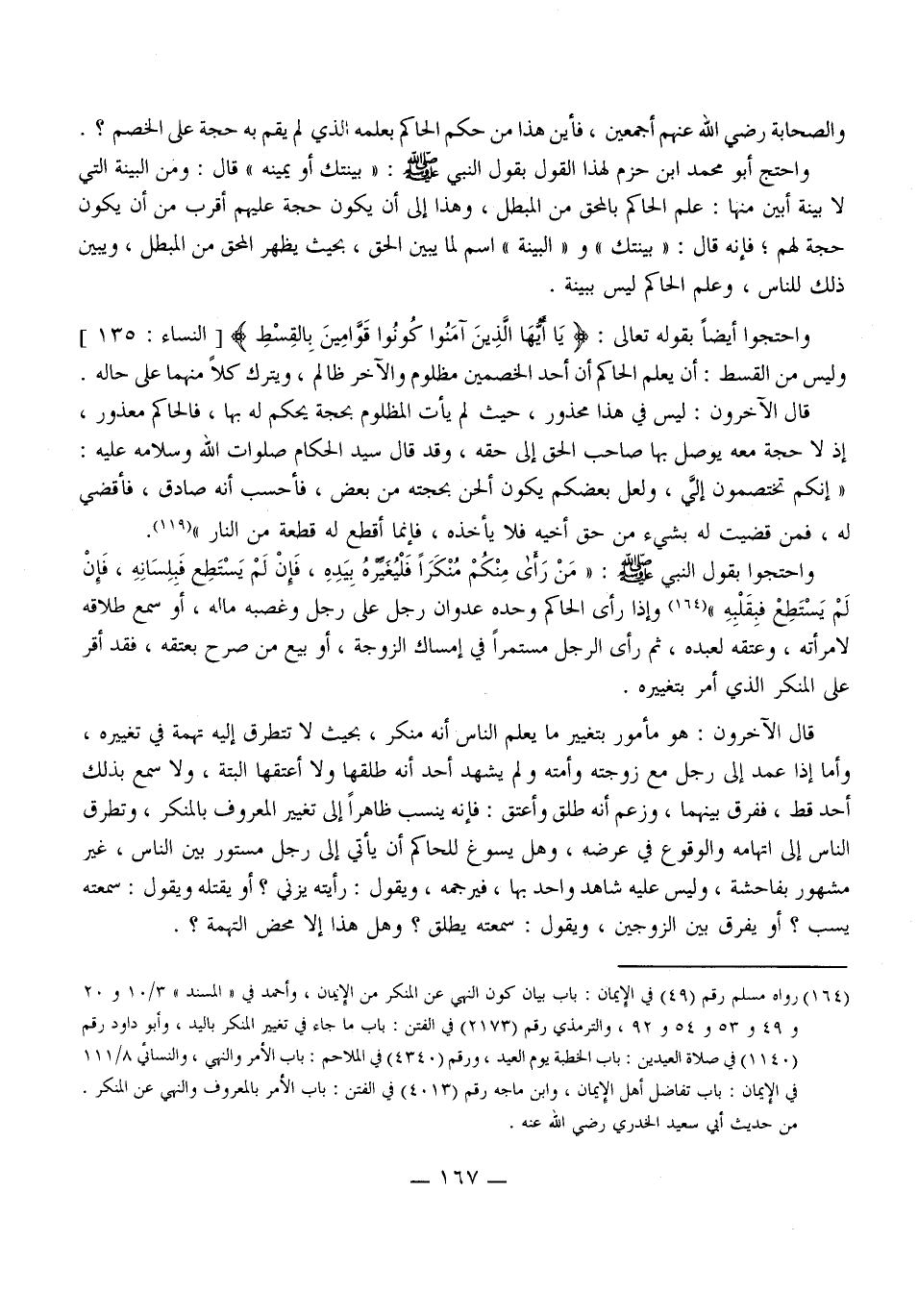 قَالَ الْآخَرُونَ: لَيْسَ فِي هَذَا مَحْذُورٌ، حَيْثُ لَمْ يَأْتِ الْمَظْلُومُ بِحُجَّةٍ يَحْكُمُ لَهُ بِهَا، فَالْحَاكِمُ مَعْذُورٌ، إذْ لَا حُجَّةَ مَعَهُ يُوصَلُ بِهَا صَاحِبُ الْحَقِّ إلَى حَقِّهِ، وَقَدْ قَالَ سَيِّدُ الْحُكَّامِ - صَلَوَاتُ اللَّهِ وَسَلَامُهُ عَلَيْهِ -: «إنَّكُمْ تَخْتَصِمُونَ إلَيَّ، وَلَعَلَّ بَعْضَكُمْ يَكُونُ أَلْحَنَ بِحُجَّتِهِ مِنْ بَعْضٍ، فَأَحْسِبُ أَنَّهُ صَادِقٌ، فَأَقْضِيَ لَهُ، فَمَنْ قَضَيْتُ لَهُ بِشَيْءٍ مِنْ حَقِّ أَخِيهِ فَلَا يَأْخُذْهُ، فَإِنَّمَا أَقْطَعُ لَهُ قِطْعَةً مِنْ النَّارِ» (119) . وَاحْتَجُّوا بِقَوْلِ النَّبِيِّ - صَلَّى اللَّهُ عَلَيْهِ وَسَلَّمَ -: «مَنْ رَأَى مِنْكُمْ مُنْكَرًا فَلْيُغَيِّرْهُ بِيَدِهِ، فَإِنْ لَمْ يَسْتَطِعْ فَبِلِسَانِهِ، فَإِنْ لَمْ يَسْتَطِعْ فَبِقَلْبِهِ» وَإِذَا رَأَى الْحَاكِمُ وَحْدَهُ عُدْوَانَ رَجُلٍ عَلَى رَجُلٍ وَغَصْبَهُ مَالَهُ، أَوْ سَمِعَ طَلَاقَهُ لِامْرَأَتِهِ، وَعِتْقَهُ لِعَبْدِهِ، ثُمَّ رَأَى الرَّجُلَ مُسْتَمِرًّا فِي إمْسَاكِ الزَّوْجَةِ، أَوْ بَيْعِ مَنْ صَرَّحَ بِعِتْقِهِ، فَقَدْ أَقَرَّ عَلَى الْمُنْكَرِ الَّذِي أُمِرَ بِتَغْيِيرِهِ.