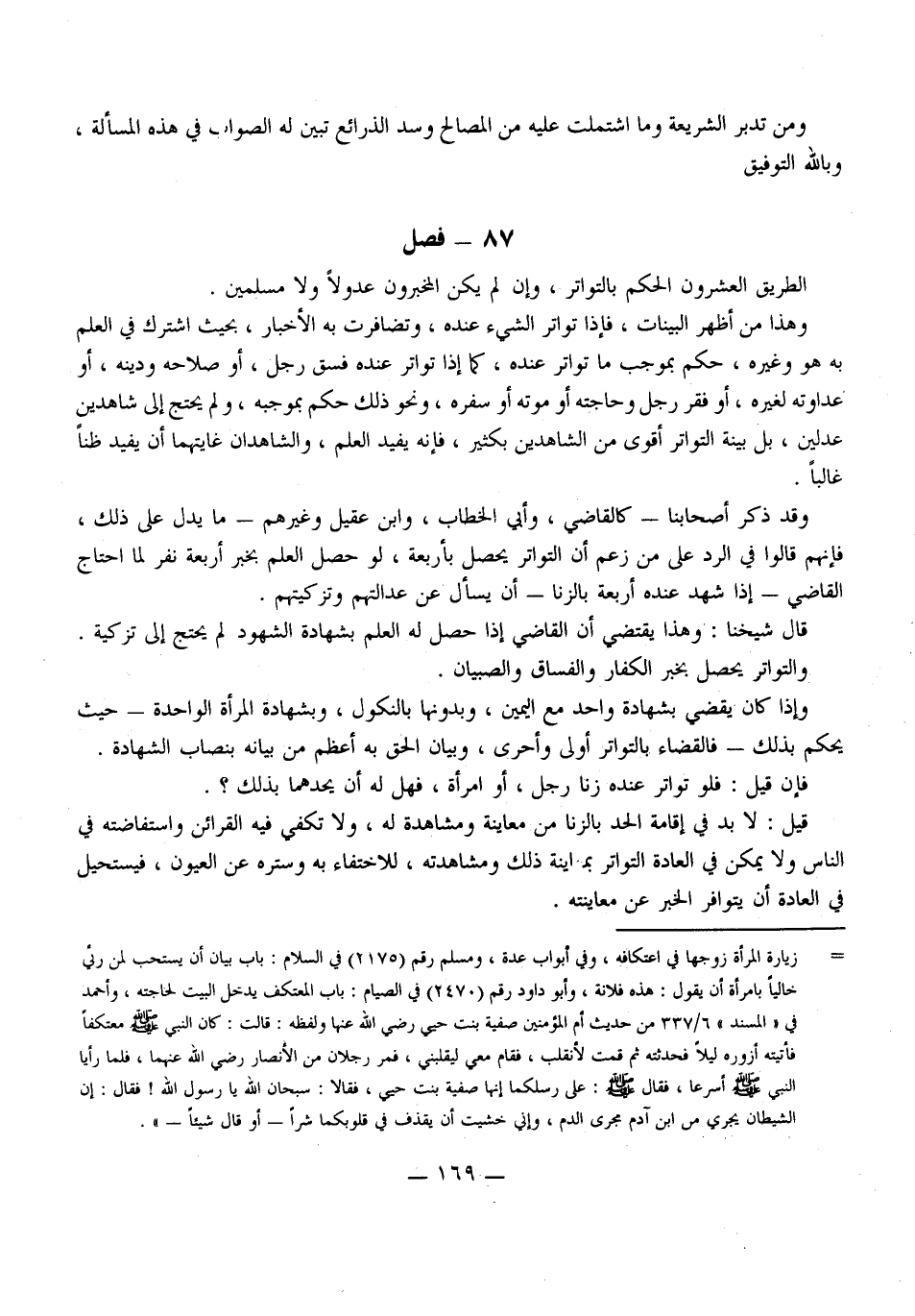 وَإِذَا كَانَ يَقْضِي بِشَهَادَةِ وَاحِدٍ مَعَ الْيَمِينِ، وَبِدُونِهَا بِالنُّكُولِ، وَبِشَهَادَةِ الْمَرْأَةِ الْوَاحِدَةِ - حَيْثُ يَحْكُمُ بِذَلِكَ - فَالْقَضَاءُ بِالتَّوَاتُرِ أَوْلَى وَأَحْرَى، وَبَيَانُ الْحَقِّ بِهِ أَعْظَمُ مِنْ بَيَانِهِ بِنِصَابِ الشَّهَادَةِ. فَإِنْ قِيلَ: فَلَوْ تَوَاتَرَ عِنْدَهُ زِنَا رَجُلٍ، أَوْ امْرَأَةٍ، فَهَلْ لَهُ أَنْ يَحُدَّهُمَا بِذَلِكَ؟ .