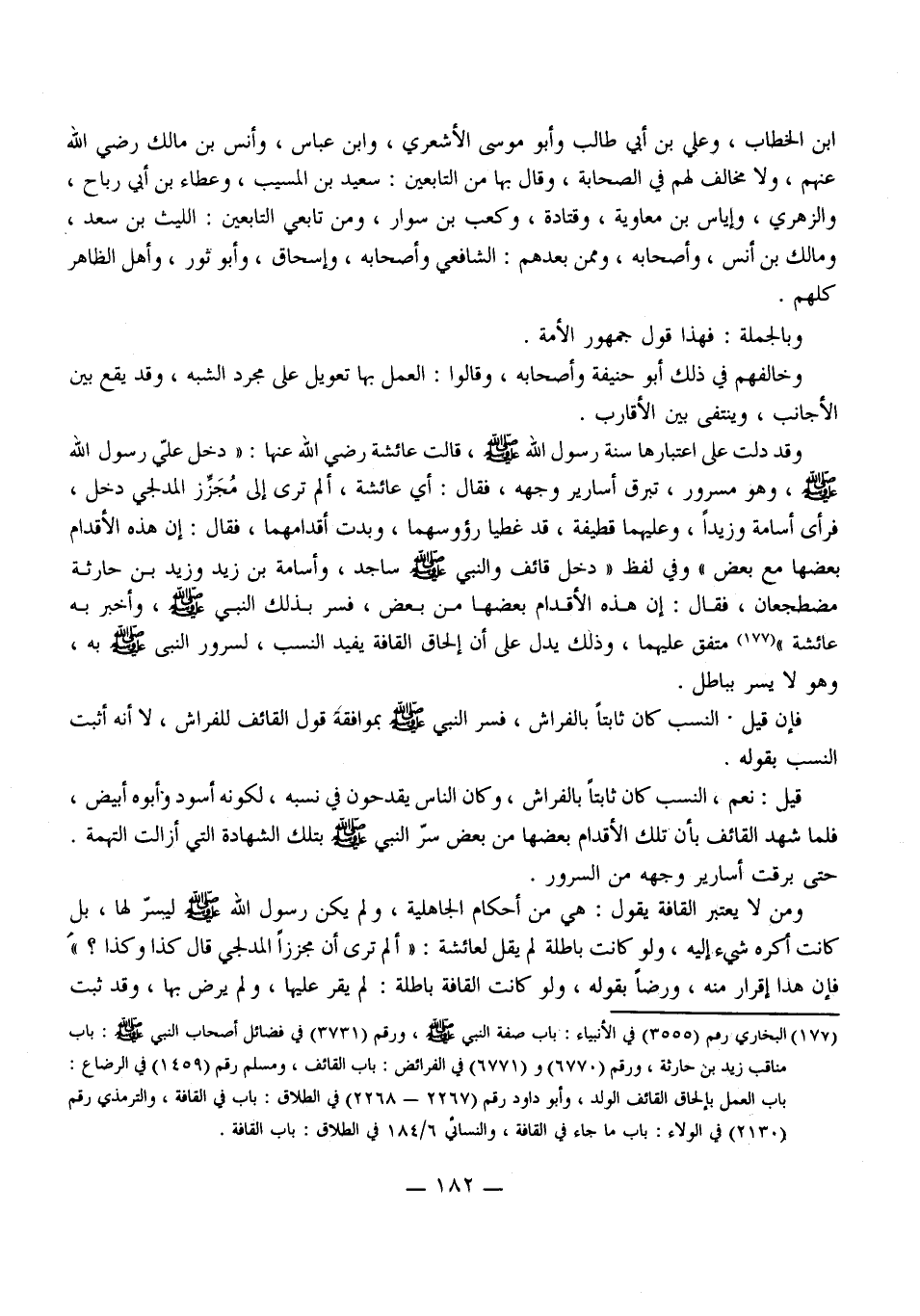 وَخَالَفَهُمْ فِي ذَلِكَ أَبُو حَنِيفَةَ وَأَصْحَابُهُ، وَقَالُوا: الْعَمَلُ بِهَا تَعْوِيلٌ عَلَى مُجَرَّدِ الشَّبَهِ، وَقَدْ يَقَعُ بَيْنَ الْأَجَانِبِ، وَيَنْتَفِي بَيْنَ الْأَقَارِبِ. وَقَدْ دَلَّتْ عَلَى اعْتِبَارِهَا سُنَّةُ رَسُولِ اللَّهِ - صَلَّى اللَّهُ عَلَيْهِ وَسَلَّمَ -، قَالَتْ عَائِشَةُ - رَضِيَ اللَّهُ عَنْهَا -: «دَخَلَ عَلَيَّ رَسُولُ اللَّهِ - صَلَّى اللَّهُ عَلَيْهِ وَسَلَّمَ - وَهُوَ مَسْرُورٌ، تَبْرُقُ أَسَارِيرُ وَجْهِهِ، فَقَالَ: أَيْ عَائِشَةُ، أَلَمْ تَرَيْ أَنَّ مُجَزِّزًا الْمُدْلِجِيَّ دَخَلَ، فَرَأَى أُسَامَةَ وَزَيْدًا، وَعَلَيْهِمَا قَطِيفَةٌ، قَدْ غَطَّيَا رُءُوسَهُمَا، وَبَدَتْ أَقْدَامُهُمَا، فَقَالَ: إنَّ هَذِهِ الْأَقْدَامَ بَعْضُهَا مِنْ بَعْضٍ» وَفِي لَفْظٍ «دَخَلَ قَائِفٌ وَالنَّبِيُّ - صَلَّى اللَّهُ عَلَيْهِ وَسَلَّمَ - سَاجِدٌ، وَأُسَامَةُ بْنُ زَيْدٍ وَزَيْدُ بْنُ حَارِثَةَ مُضْطَجِعَانِ، فَقَالَ: إنَّ هَذِهِ الْأَقْدَامَ بَعْضُهَا مِنْ بَعْضٍ، فَسُرَّ بِذَلِكَ النَّبِيُّ - صَلَّى اللَّهُ عَلَيْهِ وَسَلَّمَ - وَأَخْبَرَ بِهِ عَائِشَةَ» مُتَّفَقٌ عَلَيْهِمَا، وَذَلِكَ يَدُلُّ عَلَى أَنَّ إلْحَاقَ الْقَافَةِ يُفِيدُ النَّسَبَ، لِسُرُورِ النَّبِيِّ - صَلَّى اللَّهُ عَلَيْهِ وَسَلَّمَ - بِهِ، وَهُوَ لَا يُسَرُّ بِبَاطِلٍ.