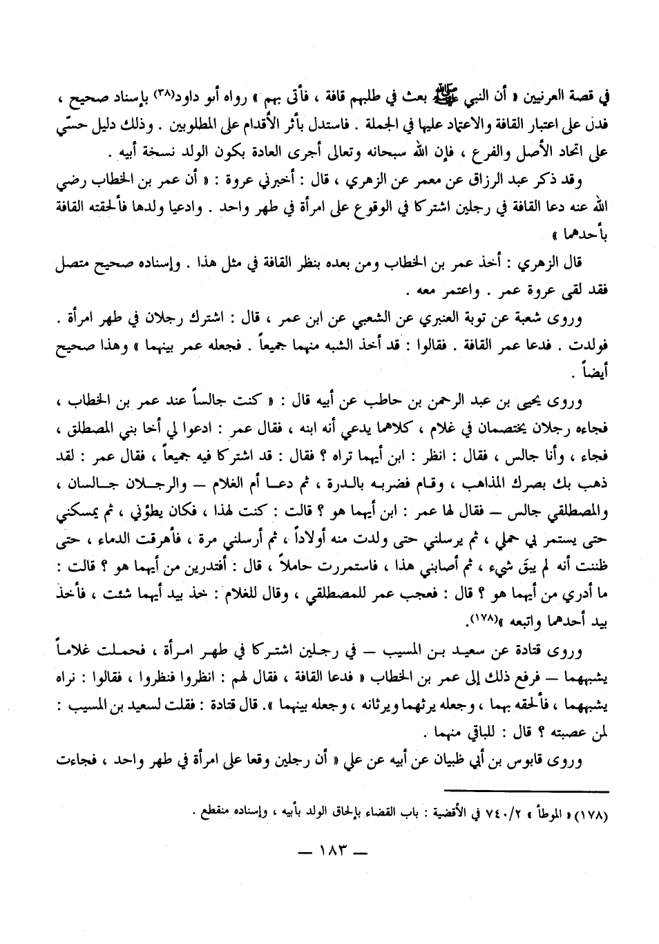 قَالَ: أَخْبَرَنِي عُرْوَةُ: " أَنَّ عُمَرَ بْنَ الْخَطَّابِ - رَضِيَ اللَّهُ عَنْهُ - دَعَا الْقَافَةَ فِي رَجُلَيْنِ اشْتَرَكَا فِي الْوُقُوعِ عَلَى امْرَأَةٍ فِي طُهْرٍ وَاحِدٍ. وَادَّعَيَا وَلَدَهَا فَأَلْحَقَتْهُ الْقَافَةُ بِأَحَدِهِمَا ".
