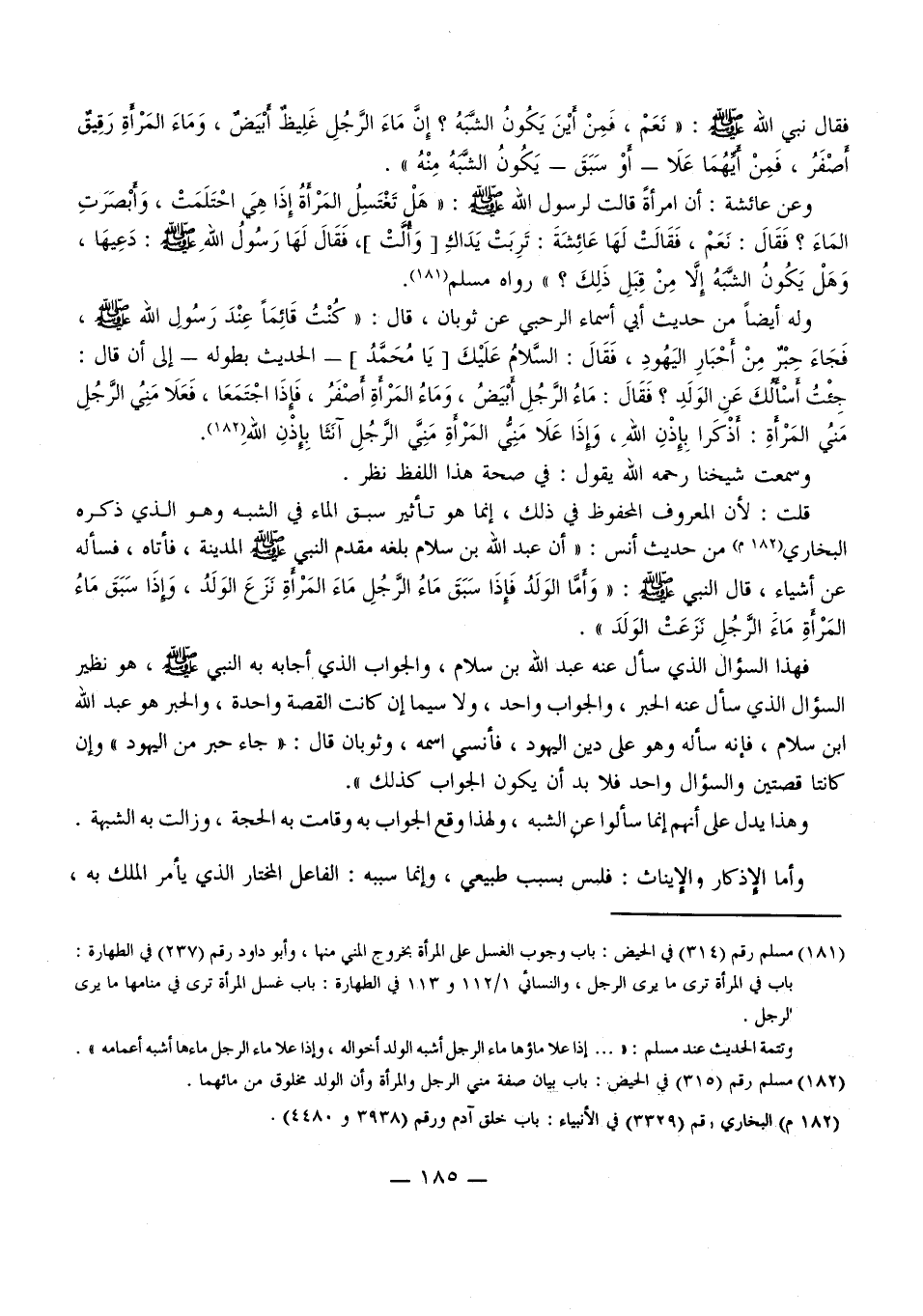 وَلَهُ أَيْضًا مِنْ حَدِيثِ أَبِي أَسْمَاءَ الرَّحَبِيِّ عَنْ ثَوْبَانَ، قَالَ: «كُنْتُ قَائِمًا عِنْدَ رَسُولِ اللَّهِ - صَلَّى اللَّهُ عَلَيْهِ وَسَلَّمَ - فَجَاءَ حَبْرٌ مِنْ أَحْبَارِ الْيَهُودِ، فَقَالَ: السَّلَامُ عَلَيْكَ يَا مُحَمَّدٌ - الْحَدِيثَ بِطُولِهِ - إلَى أَنْ قَالَ: جِئْتُ أَسْأَلُكَ عَنْ الْوَلَدِ؟ فَقَالَ: مَاءُ الرَّجُلِ أَبْيَضُ، وَمَاءُ الْمَرْأَةِ أَصْفَرُ، فَإِذَا اجْتَمَعَا، فَعَلَا مَنِيُّ الرَّجُلِ مَنِيَّ الْمَرْأَةِ: أَذْكَرَا بِإِذْنِ اللَّهِ، وَإِذَا عَلَا مَنِيُّ الْمَرْأَةِ مَنِيَّ الرَّجُلِ آنَثَا بِإِذْنِ اللَّهِ» . وَسَمِعْتُ شَيْخَنَا - رَحِمَهُ اللَّهُ - يَقُولُ: فِي صِحَّةِ هَذَا اللَّفْظِ نَظَرٌ. قُلْتُ: لِأَنَّ الْمَعْرُوفَ الْمَحْفُوظَ فِي ذَلِكَ، إنَّمَا هُوَ تَأْثِيرُ سَبْقِ الْمَاءِ فِي الشَّبَهِ وَهُوَ الَّذِي ذَكَرَهُ الْبُخَارِيُّ (182) مِنْ حَدِيثِ أَنَسٍ: " أَنَّ عَبْدَ اللَّهِ بْنَ سَلَامٍ بَلَغَهُ مَقْدَمُ النَّبِيِّ - صَلَّى اللَّهُ عَلَيْهِ وَسَلَّمَ - الْمَدِينَةَ، فَأَتَاهُ، فَسَأَلَهُ عَنْ أَشْيَاءَ، قَالَ النَّبِيُّ - صَلَّى اللَّهُ عَلَيْهِ وَسَلَّمَ -: «وَأَمَّا الْوَلَدُ فَإِذَا سَبَقَ مَاءُ الرَّجُلِ مَاءَ الْمَرْأَةِ نَزَعَ الْوَلَدَ، وَإِذَا سَبَقَ مَاءُ الْمَرْأَةِ مَاءَ الرَّجُلِ نَزَعَتْ الْوَلَدَ» .