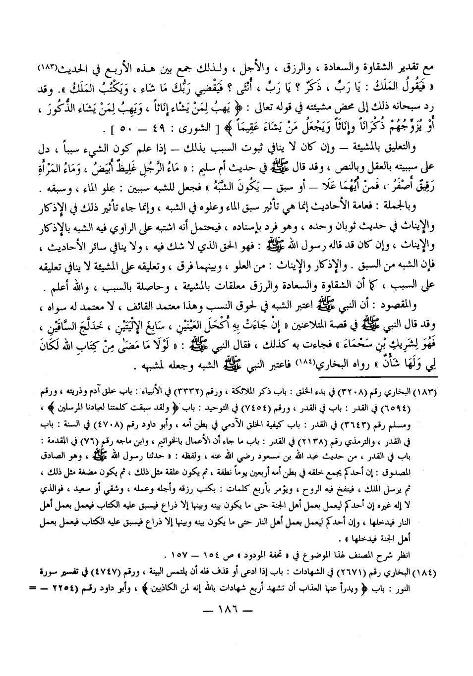 مَعَ تَقْدِيرِ الشَّقَاوَةِ وَالسَّعَادَةِ، وَالرِّزْقِ، وَالْأَجَلِ، وَلِذَلِكَ جَمَعَ بَيْنَ هَذِهِ الْأَرْبَعِ فِي الْحَدِيثِ «فَيَقُولُ الْمَلَكُ: يَا رَبِّ، ذَكَرٌ؟ يَا رَبِّ، أُنْثَى؟ فَيَقْضِي رَبُّكَ مَا شَاءَ، وَيَكْتُبُ الْمَلَكُ» .
