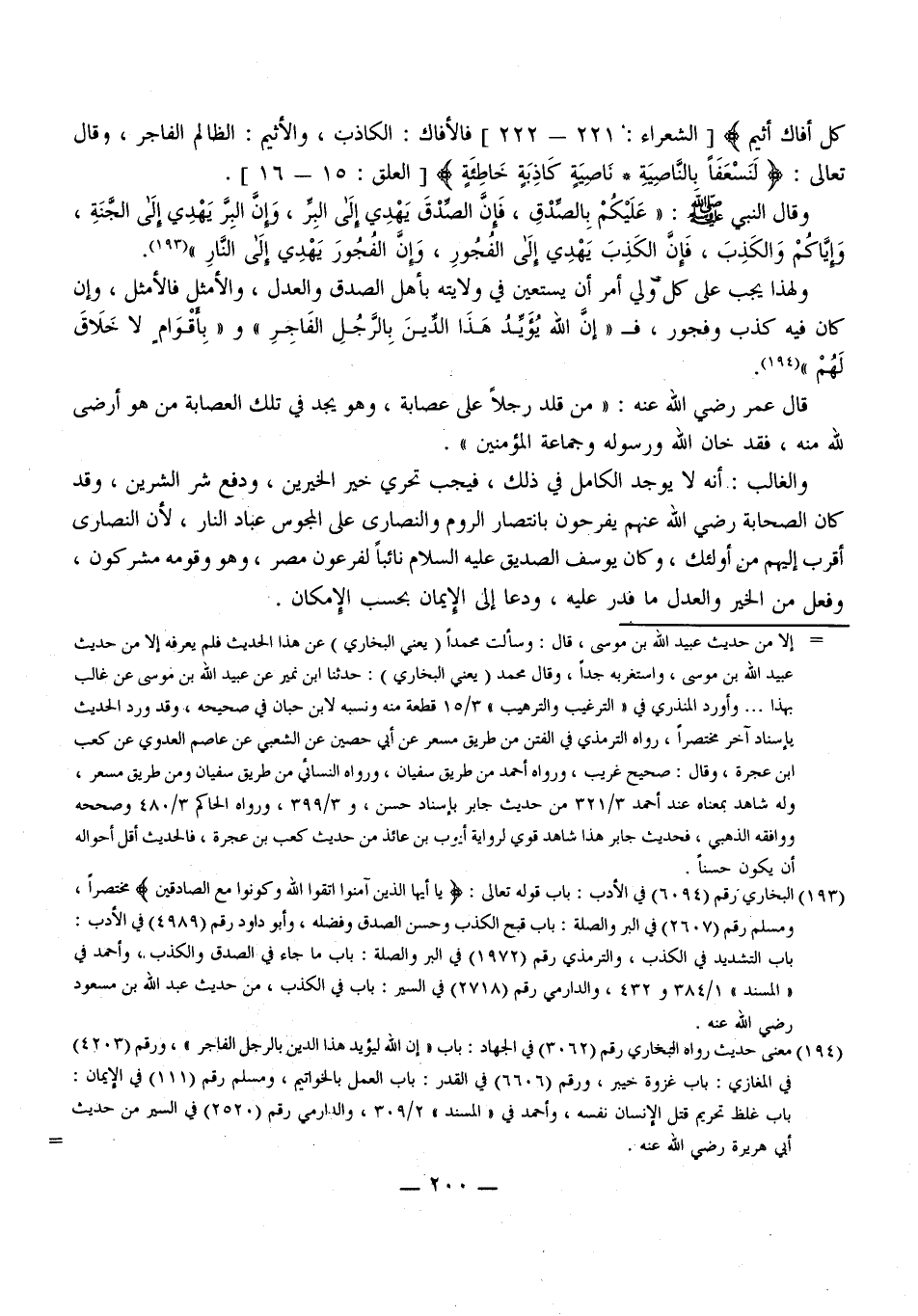 وَقَالَ تَعَالَى: {لَنَسْفَعًا بِالنَّاصِيَةِ} [العلق: 15] {نَاصِيَةٍ كَاذِبَةٍ خَاطِئَةٍ} [العلق: 16] وَقَالَ النَّبِيُّ - صَلَّى اللَّهُ عَلَيْهِ وَسَلَّمَ -: «عَلَيْكُمْ بِالصِّدْقِ، فَإِنَّ الصِّدْقَ يَهْدِي إلَى الْبِرِّ، وَإِنَّ الْبِرَّ يَهْدِي إلَى الْجَنَّةِ، وَإِيَّاكُمْ وَالْكَذِبَ، فَإِنَّ الْكَذِبَ يَهْدِي إلَى الْفُجُورِ، وَإِنَّ الْفُجُورَ يَهْدِي إلَى النَّارِ» .