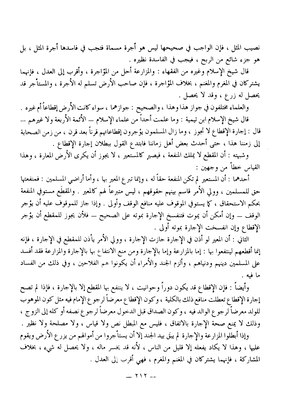 قَالَ شَيْخُ الْإِسْلَامِ ابْنُ تَيْمِيَّةَ: وَمَا عَلِمْت أَحَدًا مِنْ عُلَمَاءِ الْإِسْلَامِ - الْأَئِمَّةِ الْأَرْبَعَةِ وَلَا غَيْرِهِمْ - قَالَ: إجَارَةُ الْإِقْطَاعِ لَا تَجُوزُ، وَمَا زَالَ الْمُسْلِمُونَ يُؤَجِّرُونَ إقْطَاعَاتِهِمْ قَرْنًا بَعْدَ قَرْنٍ، مِنْ زَمَنِ الصَّحَابَةِ إلَى زَمَنِنَا هَذَا، حَتَّى أَحْدَثَ بَعْضُ أَهْلِ زَمَانِنَا فَابْتُدِعَ الْقَوْلَ بِبُطْلَانِ إجَارَةِ الْإِقْطَاعِ.