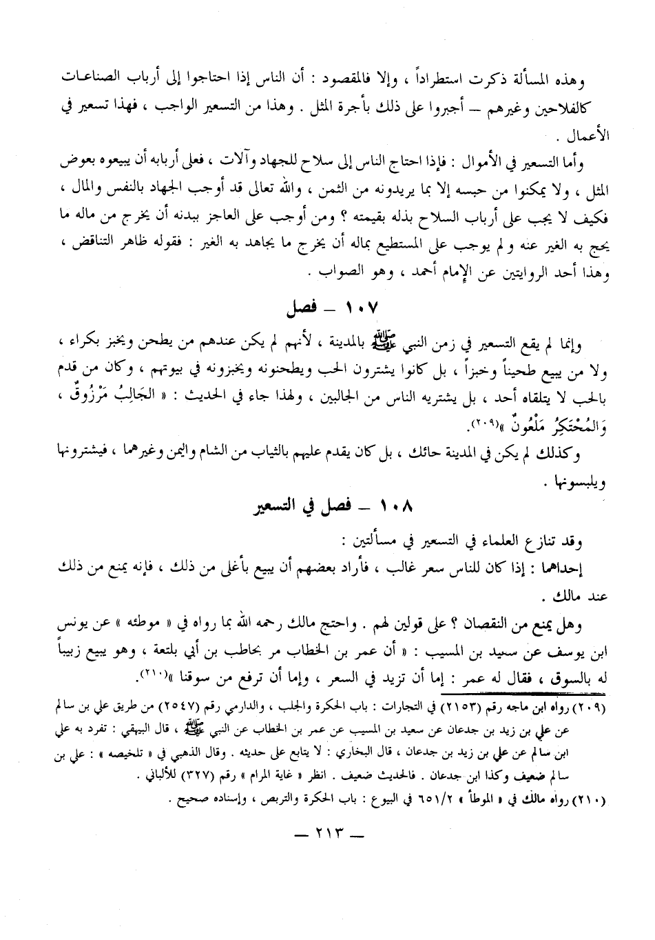 فِي التَّسْعِيرِ وَقَدْ تَنَازَعَ الْعُلَمَاءُ فِي التَّسْعِيرِ فِي مَسْأَلَتَيْنِ: إحْدَاهُمَا: إذَا كَانَ لِلنَّاسِ سِعْرٌ غَالِبٌ، فَأَرَادَ بَعْضُهُمْ أَنْ يَبِيعَ بِأَغْلَى مِنْ ذَلِكَ، فَإِنَّهُ يُمْنَعُ مِنْ ذَلِكَ عِنْدَ مَالِكٍ. وَهَلْ يُمْنَعُ مِنْ النُّقْصَانِ؟ عَلَى قَوْلَيْنِ لَهُمْ. وَاحْتَجَّ مَالِكٌ - رَحِمَهُ اللَّهُ - بِمَا رَوَاهُ فِي مُوَطَّئِهِ " عَنْ يُونُسَ بْنِ يُوسُفَ عَنْ سَعِيدِ بْنِ الْمُسَيِّبِ: " أَنَّ عُمَرَ بْنَ الْخَطَّابِ مَرَّ بِحَاطِبِ بْنِ أَبِي بَلْتَعَةَ، وَهُوَ يَبِيعُ زَبِيبًا لَهُ بِالسُّوقِ، فَقَالَ لَهُ عُمَرُ: إمَّا أَنْ تَزِيدَ فِي السِّعْرِ، وَإِمَّا أَنْ تَرْفَعَ مِنْ سُوقِنَا ".