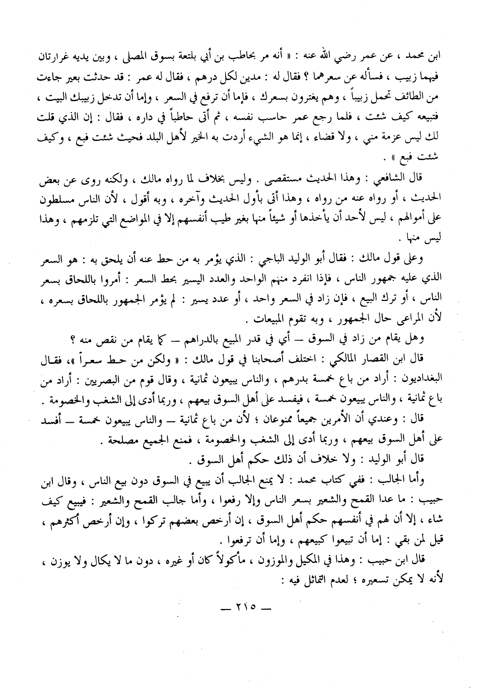 عَنْ عُمَرَ - رَضِيَ اللَّهُ عَنْهُ -: " أَنَّهُ مَرَّ بِحَاطِبِ بْنِ أَبِي بَلْتَعَةَ بِسُوقِ الْمُصَلَّى، وَبَيْنَ يَدَيْهِ غِرَارَتَانِ فِيهِمَا زَبِيبٌ، فَسَأَلَهُ عَنْ سِعْرِهِمَا؟ فَقَالَ لَهُ: مُدَّيْنِ لِكُلِّ دِرْهَمٍ، فَقَالَ لَهُ عُمَرُ: قَدْ حُدِّثْت بَعِيرٍ جَاءَتْ مِنْ الطَّائِفِ تَحْمِلُ زَبِيبًا، وَهُمْ يَغْتَرُّونَ بِسِعْرِك، فَإِمَّا أَنْ تَرْفَعَ فِي السِّعْرِ، وَإِمَّا أَنْ تُدْخِلَ زَبِيبَك الْبَيْتَ، فَتَبِيعَهُ كَيْفَ شِئْت، فَلَمَّا رَجَعَ عُمَرُ حَاسَبَ نَفْسَهُ، ثُمَّ أَتَى حَاطِبًا فِي دَارِهِ، فَقَالَ: إنَّ الَّذِي قُلْتَ لَك لَيْسَ عَزْمَةً مِنِّي، وَلَا قَضَاءً، إنَّمَا هُوَ الشَّيْءُ أَرَدْت بِهِ الْخَيْرَ لِأَهْلِ الْبَلَدِ فَحَيْثُ شِئْت فَبِعْ، وَكَيْفَ شِئْت فَبِعْ ".