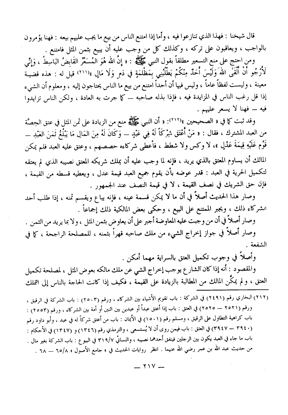 وَقَدْ ثَبَتَ كَمَا فِي " الصَّحِيحَيْنِ ": " أَنَّ النَّبِيَّ - صَلَّى اللَّهُ عَلَيْهِ وَسَلَّمَ - مَنَعَ مِنْ الزِّيَادَةِ عَلَى ثَمَنِ الْمِثْلِ فِي عِتْقِ الْحِصَّةِ مِنْ الْعَبْدِ الْمُشْتَرَكِ، فَقَالَ: «مَنْ أَعْتَقَ شِرْكًا لَهُ فِي عَبْدٍ - وَكَانَ لَهُ مِنْ الْمَالِ مَا يَبْلُغُ ثَمَنَ الْعَبْدِ - قُوِّمَ عَلَيْهِ قِيمَةَ عَدْلٍ» ، لَا وَكْسَ وَلَا شَطَطَ، فَأَعْطَى شُرَكَاءَهُ حِصَصَهُمْ، وَعَتَقَ عَلَيْهِ الْعَبْدُ فَلَمْ يُمْكِنْ الْمَالِكَ أَنْ يُسَاوِمَ الْمُعْتِقَ بِاَلَّذِي يُرِيدُ، فَإِنَّهُ لَمَّا وَجَبَ عَلَيْهِ أَنْ يُمَلِّكَ شَرِيكَهُ الْمُعْتَقَ نَصِيبَهُ الَّذِي لَمْ يُعْتِقْهُ لِتَكْمِيلِ الْحُرِّيَّةِ فِي الْعَبْدِ: قَدَّرَ عِوَضَهُ بِأَنْ يُقَوِّمَ جَمِيعَ الْعَبْدِ قِيمَةَ عَدْلٍ، وَيُعْطِيهِ قِسْطَهُ مِنْ الْقِيمَةِ، فَإِنَّ حَقَّ الشَّرِيكِ فِي نِصْفِ الْقِيمَةِ، لَا فِي قِيمَةِ النِّصْفِ عِنْدَ الْجُمْهُورِ. وَصَارَ هَذَا الْحَدِيثُ أَصْلًا فِي أَنَّ مَا لَا يُمْكِنُ قِسْمَةُ عَيْنِهِ، فَإِنَّهُ يُبَاعُ وَيُقْسَمُ ثَمَنُهُ، إذَا طَلَبَ أَحَدُ الشُّرَكَاءِ ذَلِكَ، وَيُجْبَرُ الْمُمْتَنِعُ عَلَى الْبَيْعِ، وَحَكَى بَعْضُ الْمَالِكِيَّةِ ذَلِكَ إجْمَاعًا. وَصَارَ أَصْلًا فِي أَنَّ مَنْ وَجَبَتْ عَلَيْهِ الْمُعَاوَضَةُ أُجْبِرَ عَلَى أَنْ يُعَاوِضَ بِثَمَنِ الْمِثْلِ، وَلَا بِمَا يُرِيدُ مِنْ الثَّمَنِ.