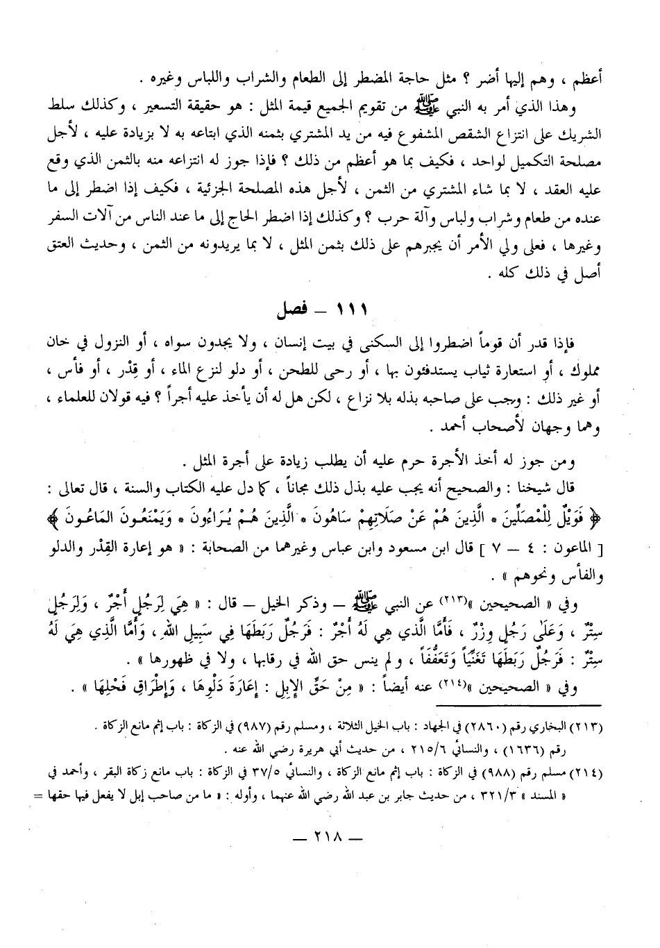 قَالَ شَيْخُنَا: وَالصَّحِيحُ أَنَّهُ يَجِبُ عَلَيْهِ بَذْلُ ذَلِكَ مَجَّانًا، كَمَا دَلَّ عَلَيْهِ الْكِتَابُ وَالسُّنَّةُ، قَالَ تَعَالَى: {فَوَيْلٌ لِلْمُصَلِّينَ} [الماعون: 4] {الَّذِينَ هُمْ عَنْ صَلاتِهِمْ سَاهُونَ} [الماعون: 5] {الَّذِينَ هُمْ يُرَاءُونَ} [الماعون: 6] {وَيَمْنَعُونَ الْمَاعُونَ} [الماعون: 7] قَالَ ابْنُ مَسْعُودٍ وَابْنُ عَبَّاسٍ وَغَيْرُهُمَا مِنْ الصَّحَابَةِ: " هُوَ إعَارَةُ الْقِدْرِ وَالدَّلْوِ وَالْفَأْسِ وَنَحْوِهِمْ ".