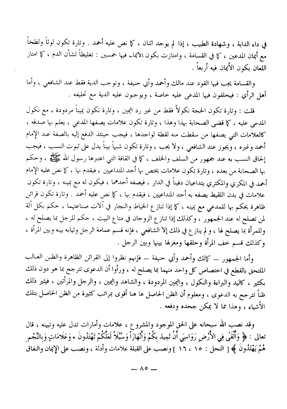 قُلْتُ: وَتَارَةً تَكُونُ الْحُجَّةُ نُكُولًا فَقَطْ مِنْ غَيْرِ رَدِّ الْيَمِينِ، وَتَارَةً تَكُونُ يَمِينًا مَرْدُودَةً، مَعَ نُكُولِ الْمُدَّعَى عَلَيْهِ، كَمَا قَضَى الصَّحَابَةُ بِهَذَا وَهَذَا، وَتَارَةً تَكُونُ عَلَامَاتٍ يَصِفُهَا الْمُدَّعِي، يُعْلَمُ بِهَا صِدْقُهُ، كَالْعَلَامَاتِ الَّتِي يَصِفُهَا مَنْ سَقَطَتْ مِنْهُ لُقَطَةً لِوَاجِدِهَا، فَيَجِبُ حِينَئِذٍ الدَّفْعُ إلَيْهِ بِالصِّفَةِ عِنْدَ الْإِمَامِ أَحْمَدَ وَغَيْرِهِ، وَيَجُوزُ عِنْدَ الشَّافِعِيِّ، وَلَا يَجِبُ، وَتَارَةً تَكُونُ شَبَهًا بَيِّنًا يَدُلُّ عَلَى ثُبُوتِ النَّسَبِ، فَيَجِبُ إلْحَاقُ النَّسَبِ بِهِ عِنْدَ جُمْهُورٍ مِنْ السَّلَفِ وَالْخَلَفِ، كَمَا فِي الْقَافَةِ الَّتِي اعْتَبَرَهَا رَسُولُ اللَّهِ، وَحَكَمَ بِهَا الصَّحَابَةُ مِنْ بَعْدِهِ، وَتَارَةً تَكُونُ عَلَامَاتٍ يَخْتَصُّ بِهَا أَحَدُ الْمُتَدَاعِيَيْنِ، فَيُقَدَّمُ بِهَا، كَمَا نَصَّ عَلَيْهِ الْإِمَامُ أَحْمَدُ فِي الْمُكْرِي وَالْمُكْتَرِي يَتَدَاعَيَانِ دَفِينًا فِي الدَّارِ، فَيَصِفُهُ أَحَدُهُمَا، فَيَكُونُ لَهُ مَعَ يَمِينِهِ، وَتَارَةً تَكُونُ عَلَامَاتٍ فِي بَدَنِ اللَّقِيطِ يَصِفُهُ بِهِ أَحَدُ الْمُتَدَاعِيَيْنِ، فَيُقَدَّمُ بِهَا، كَمَا نَصَّ عَلَيْهِ أَحْمَدُ.