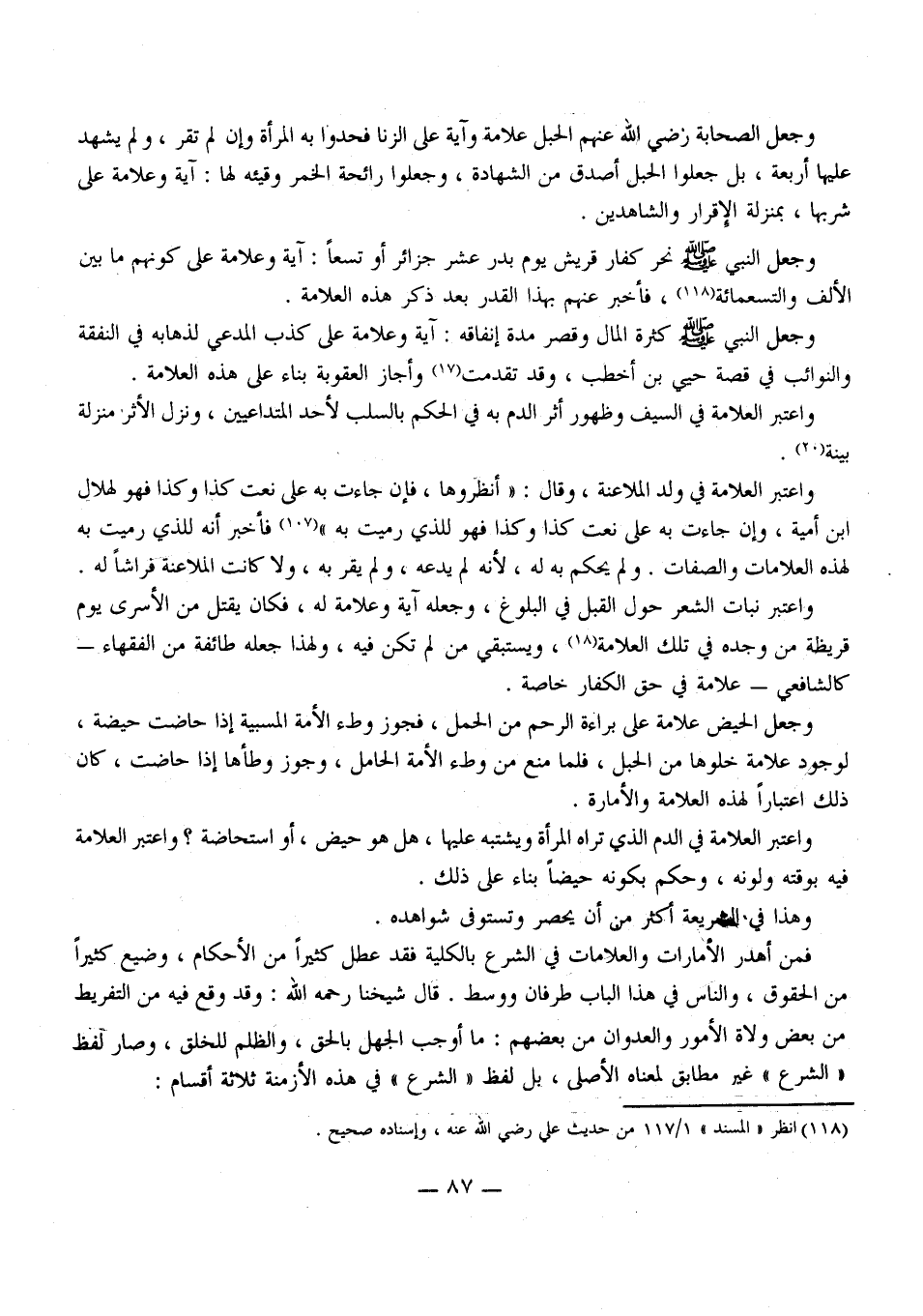 وَاعْتَبَرَ الْعَلَامَةَ فِي الدَّمِ الَّذِي تَرَاهُ الْمَرْأَةُ وَيُشْتَبَهُ عَلَيْهَا، هَلْ هُوَ حَيْضٌ، أَوْ اسْتِحَاضَةٌ؟ وَاعْتَبَرَ الْعَلَامَةَ فِيهِ بِوَقْتِهِ وَلَوْنِهِ، وَحَكَمَ بِكَوْنِهِ حَيْضًا بِنَاءً عَلَى ذَلِكَ. وَهَذَا فِي الشَّرِيعَةِ أَكْثَرُ مِنْ أَنْ يُحْصَرَ وَتُسْتَوْفَى شَوَاهِدُهُ.