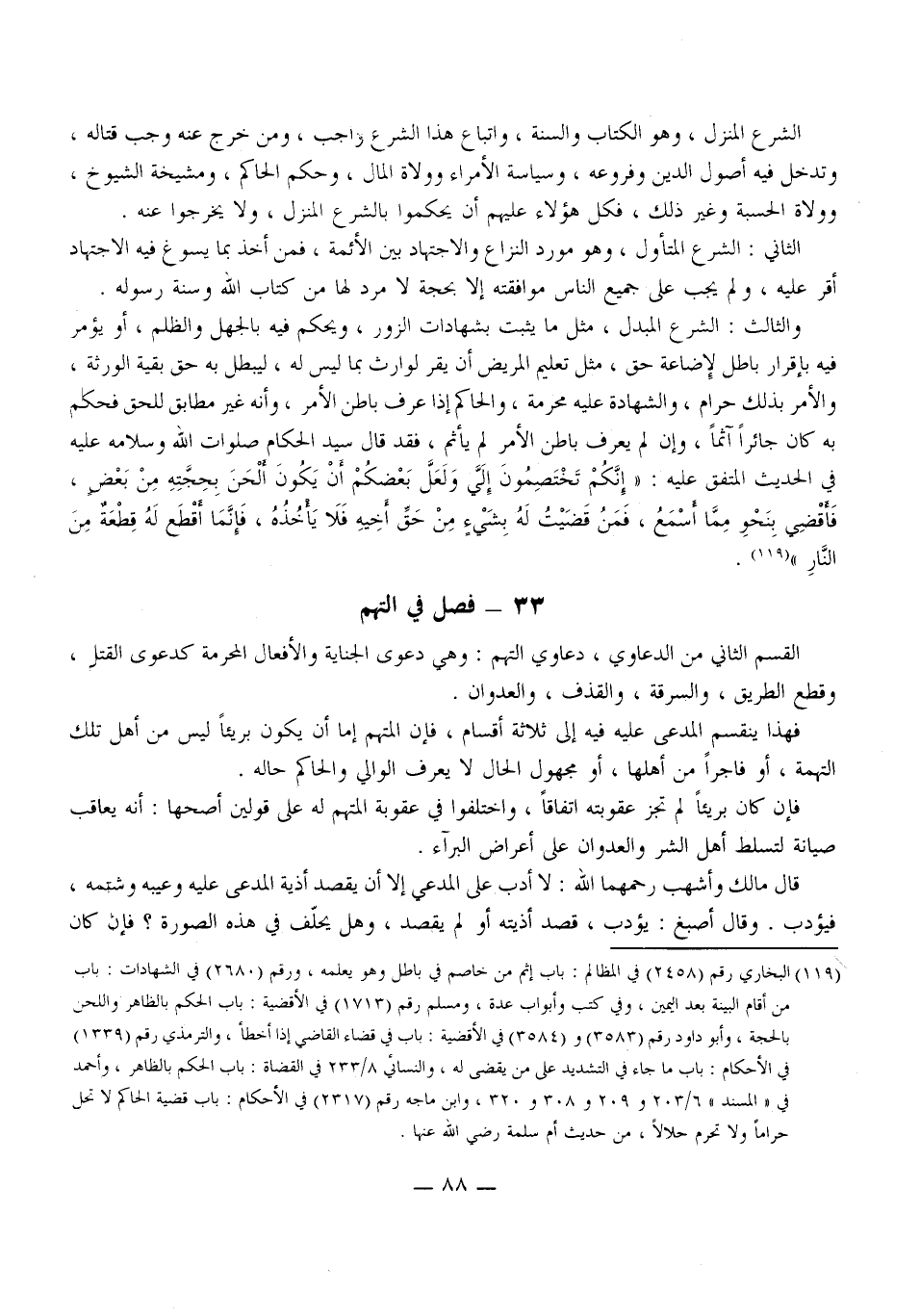 الثَّانِي: الشَّرْعُ الْمُتَأَوَّلُ، وَهُوَ مَوْرِدُ النِّزَاعِ وَالِاجْتِهَادِ بَيْنَ الْأَئِمَّةِ، فَمَنْ أَخَذَ بِمَا يُسَوَّغُ فِيهِ الِاجْتِهَادُ أُقِرَّ عَلَيْهِ، وَلَمْ يَجِبْ عَلَى جَمِيعِ النَّاسِ مُوَافَقَتُهُ إلَّا بِحُجَّةٍ لَا مَرَدَّ لَهَا مِنْ كِتَابِ اللَّهِ وَسُنَّةِ رَسُولِهِ.