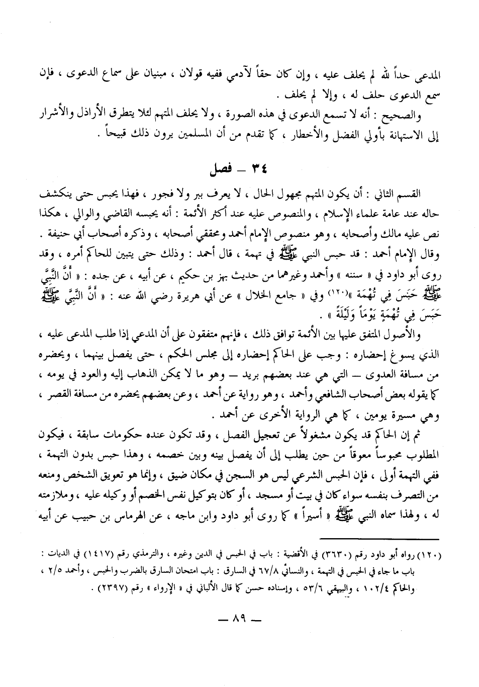 وَقَالَ الْإِمَام أَحْمَدُ: قَدْ حَبَسَ النَّبِيُّ - صَلَّى اللَّهُ عَلَيْهِ وَسَلَّمَ - فِي تُهْمَةٍ، قَالَ أَحْمَدُ: وَذَلِكَ حَتَّى يَتَبَيَّنَ لِلْحَاكِمِ أَمْرُهُ، وَقَدْ رَوَى أَبُو دَاوُد فِي سُنَنِهِ " وَأَحْمَدُ وَغَيْرُهُمَا مِنْ حَدِيثِ بَهْزِ بْنِ حَكِيمٍ، عَنْ أَبِيهِ، عَنْ جَدِّهِ: «أَنَّ النَّبِيَّ - صَلَّى اللَّهُ عَلَيْهِ وَسَلَّمَ - حَبَسَ فِي تُهْمَةٍ»