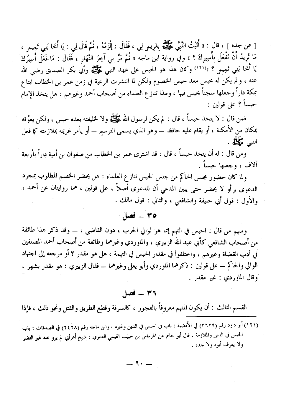 وَفِي رِوَايَةِ ابْنِ مَاجَهْ «ثُمَّ مَرَّ بِي آخِرَ النَّهَارِ، فَقَالَ: مَا فَعَلَ أَسِيرُكَ يَا أَخَا بَنِي تَمِيمٍ؟» وَكَانَ هَذَا هُوَ الْحَبْسُ عَلَى عَهْدِ النَّبِيِّ - صَلَّى اللَّهُ عَلَيْهِ وَسَلَّمَ - وَأَبِي بَكْرٍ الصِّدِّيقِ - رَضِيَ اللَّهُ عَنْهُ - وَلَمْ يَكُنْ لَهُ مَحْبِسٌ مُعَدٌّ لِحَبْسِ الْخُصُومِ وَلَكِنْ لَمَّا انْتَشَرَتْ الرَّعِيَّةُ فِي زَمَنِ عُمَرَ بْنِ الْخَطَّابِ ابْتَاعَ بِمَكَّةَ دَارًا وَجَعَلَهَا سِجْنًا يَحْبِسُ فِيهَا، وَلِهَذَا تَنَازَعَ الْعُلَمَاءُ مِنْ أَصْحَابِ أَحْمَدَ وَغَيْرِهِمْ: هَلْ يَتَّخِذُ الْإِمَامُ حَبْسًا؟ عَلَى قَوْلَيْنِ: فَمَنْ قَالَ: لَا يَتَّخِذُ حَبْسًا، قَالَ: لَمْ يَكُنْ لِرَسُولِ اللَّهِ - صَلَّى اللَّهُ عَلَيْهِ وَسَلَّمَ - وَلَا لِخَلِيفَتِهِ بَعْدَهُ حَبْسٌ، وَلَكِنْ يُعَوِّقُهُ بِمَكَانٍ مِنْ الْأَمْكِنَةِ، أَوْ يُقَامُ عَلَيْهِ حَافِظٌ - وَهُوَ الَّذِي يُسَمَّى التَّرْسِيمَ أَوْ يَأْمُرُ غَرِيمَهُ بِمُلَازَمَتِهِ كَمَا فَعَلَ النَّبِيُّ - صَلَّى اللَّهُ عَلَيْهِ وَسَلَّمَ -.
