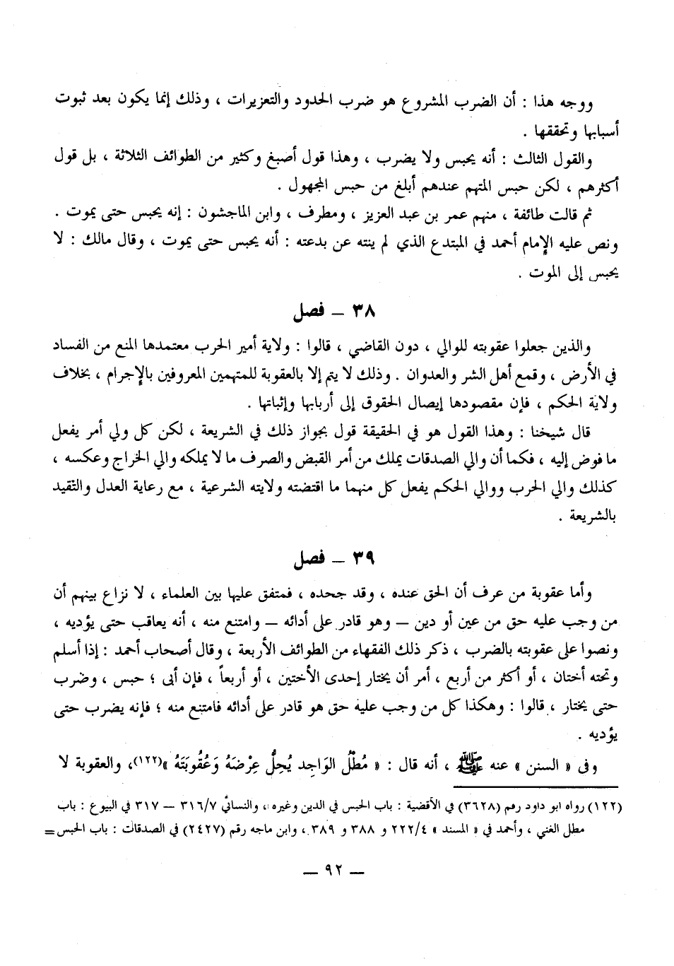 وَفِي " السُّنَنِ " عَنْهُ - صَلَّى اللَّهُ عَلَيْهِ وَسَلَّمَ - أَنَّهُ قَالَ: «مَطْلُ الْوَاجِدِ يُحِلُّ عِرْضَهُ وَعُقُوبَتَهُ» ، وَالْعُقُوبَةُ لَا