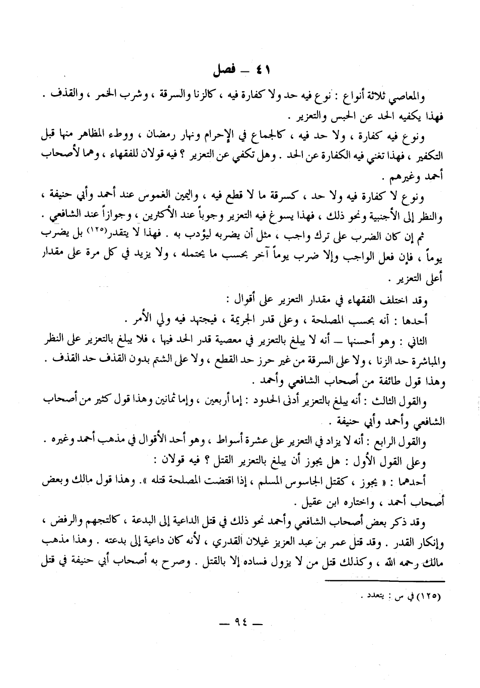 وَالْمَعَاصِي ثَلَاثَةُ أَنْوَاعٍ: نَوْعٌ فِيهِ حَدٌّ وَلَا كَفَّارَةَ فِيهِ، كَالزِّنَا وَالسَّرِقَةِ، وَشُرْبِ الْخَمْرِ، وَالْقَذْفِ. فَهَذَا يَكْفِيهِ الْحَدُّ عَنْ الْحَبْسِ وَالتَّعْزِيرِ. وَنَوْعٌ فِيهِ كَفَّارَةٌ، وَلَا حَدَّ فِيهِ، كَالْجِمَاعِ فِي الْإِحْرَامِ وَنَهَارِ رَمَضَانَ، وَوَطْءِ الْمُظَاهِرِ مِنْهَا قَبْلَ التَّكْفِيرِ، فَهَذَا تُغْنِي فِيهِ الْكَفَّارَةُ عَنْ الْحَدِّ.