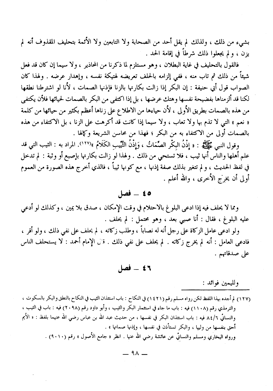 وَقَوْلُ النَّبِيِّ - صَلَّى اللَّهُ عَلَيْهِ وَسَلَّمَ -: «إذْنُ الْبِكْرِ الصُّمَاتُ، وَإِذْنُ الثَّيِّبِ الْكَلَامُ» الْمُرَادُ بِهِ: الثَّيِّبُ الَّتِي قَدْ عَلِمَ أَهْلُهَا وَالنَّاسُ أَنَّهَا ثَيِّبٌ، فَلَا تَسْتَحْيِي مِنْ ذَلِكَ.