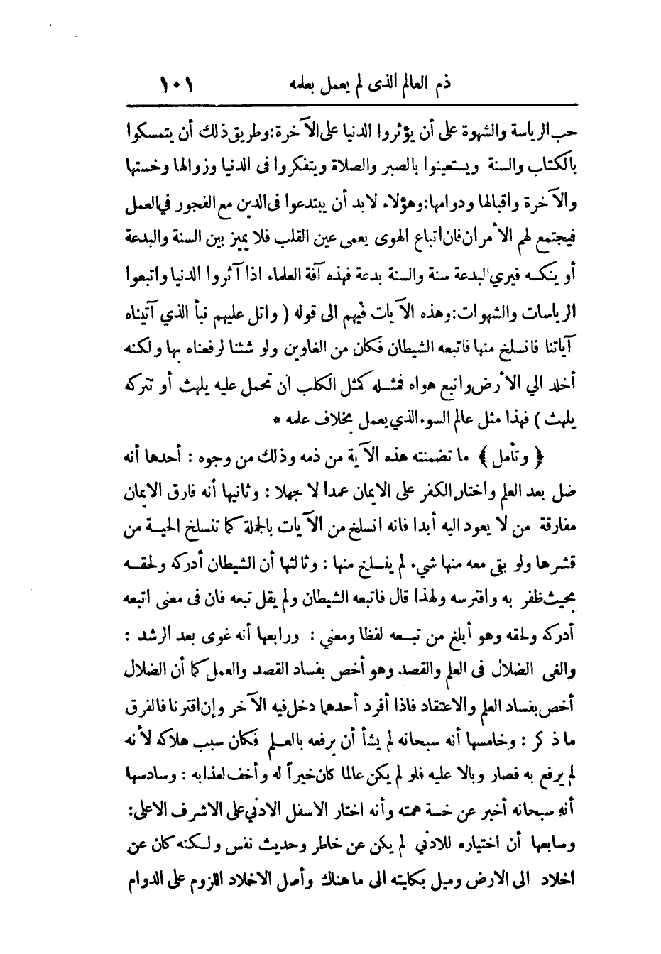 حب الرياسة والشهوة على أَن يؤثروا الدُّنْيَا على الْآخِرَة وَطَرِيق ذَلِك أَن يَتَمَسَّكُوا بِالْكتاب وَالسّنة ويستعينوا بِالصبرِ وَالصَّلَاة ويتفكروا فِي الدُّنْيَا وزوالها وخستها وَالْآخِرَة وإقبالها ودوامها وَهَؤُلَاء لَا بُد أَن يبتدعوا فِي الدّين مَعَ الْفُجُور فِي الْعَمَل فيجتمع لَهُم الْأَمْرَانِ فَإِن اتِّبَاع الْهوى يعمي عين الْقلب فَلَا يُمَيّز بَين السّنة والبدعة أَو ينكسه فَيرى الْبِدْعَة سنة وَالسّنة بِدعَة فَهَذِهِ آفَة الْعلمَاء إِذا آثروا الدُّنْيَا وَاتبعُوا الرياسات والشهوات وَهَذِه الْآيَات فيهم إِلَيّ قَوْله