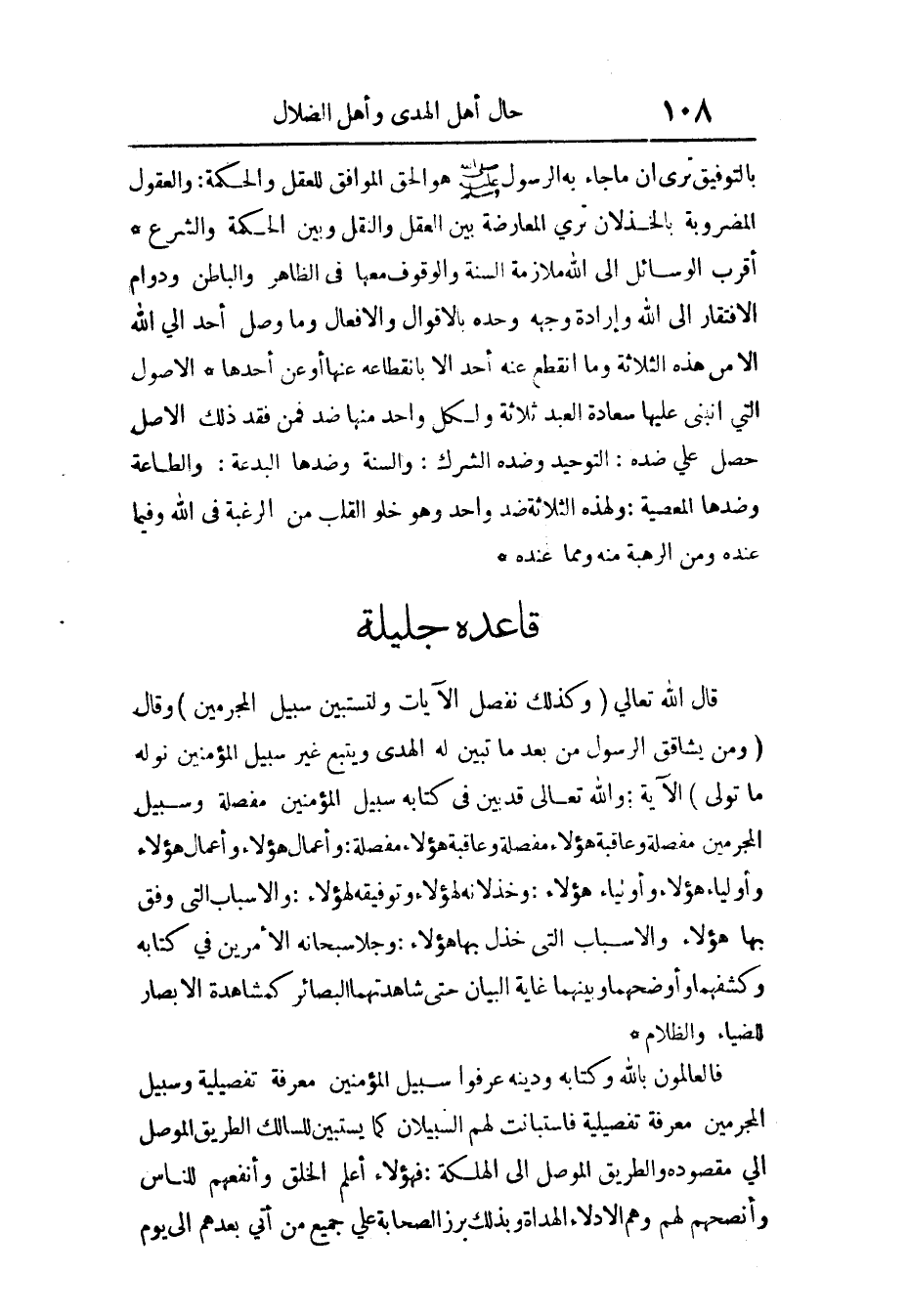 بالتوفيق ترى أَن مَا جَاءَ بِهِ الرَّسُول هُوَ الْحق الْمُوَافق لِلْعَقْلِ وَالْحكمَة والعقول المضروبة بالخذلان ترى الْمُعَارضَة بَين الْعقل وَالنَّقْل وَبَين الْحِكْمَة وَالشَّرْع أقرب الْوَسَائِل إِلَى الله مُلَازمَة السّنة وَالْوُقُوف مَعهَا فِي الظَّاهِر وَالْبَاطِن ودوام الافتقار إِلَى الله وَإِرَادَة وَجهه وَحده بالأقوال وَالْأَفْعَال وَمَا وصل أحد إِلَى الله إِلَّا من هَذِه الثَّلَاثَة وَمَا انْقَطع عَنهُ أحد إِلَّا بانقطاعه عَنْهَا أَو عَن أَحدهَا الْأُصُول الَّتِي انبنى عَلَيْهَا سَعَادَة العَبْد ثَلَاثَة وَلكُل وَاحِد مِنْهَا ضد فَمن فقد ذَلِك الأَصْل حصل على ضِدّه التَّوْحِيد وضده الشّرك وَالسّنة وضدها الْبِدْعَة وَالطَّاعَة وضدها الْمعْصِيَة ولهذه الثَّلَاثَة ضد وَاحِد وَهُوَ خلو الْقلب من الرَّغْبَة فِي الله وَفِيمَا عِنْده وَمن الرهبة مِنْهُ وَمِمَّا عِنْده