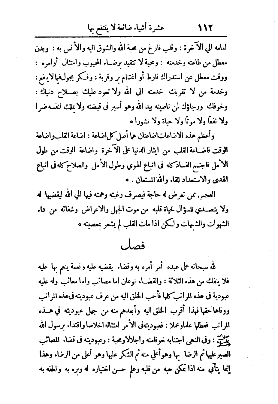 أَمَامه إِلَى الْآخِرَة وقلب فارغ من محبَّة الله والشوق إِلَيْهِ والأنس بِهِ وبدن معطل من طَاعَته وخدمته ومحبة لَا تتقيد برضاء المحبوب وامتثال أوامره وَوقت معطل عَن اسْتِدْرَاك فارطه أَو اغتنام بر وقربة وفكر يجول فِيمَا لَا ينفع وخدمة من لَا تقربك خدمته إِلَى الله وَلَا تعود عَلَيْك بصلاح دنياك وخوفك ورجاؤك لمن ناصيته بيد الله وَهُوَ أسبر فِي قَبضته وَلَا يملك لنَفسِهِ حذرا وَلَا نفعا وَلَا موتا وَلَا حَيَاة وَلَا نشورا